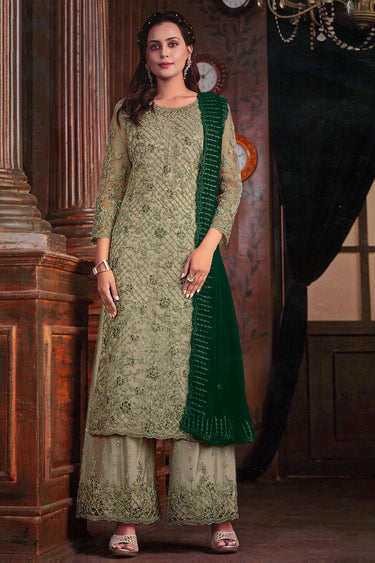 Charming Sea Green Color Net Fabric Embroidered Palazzo Suit