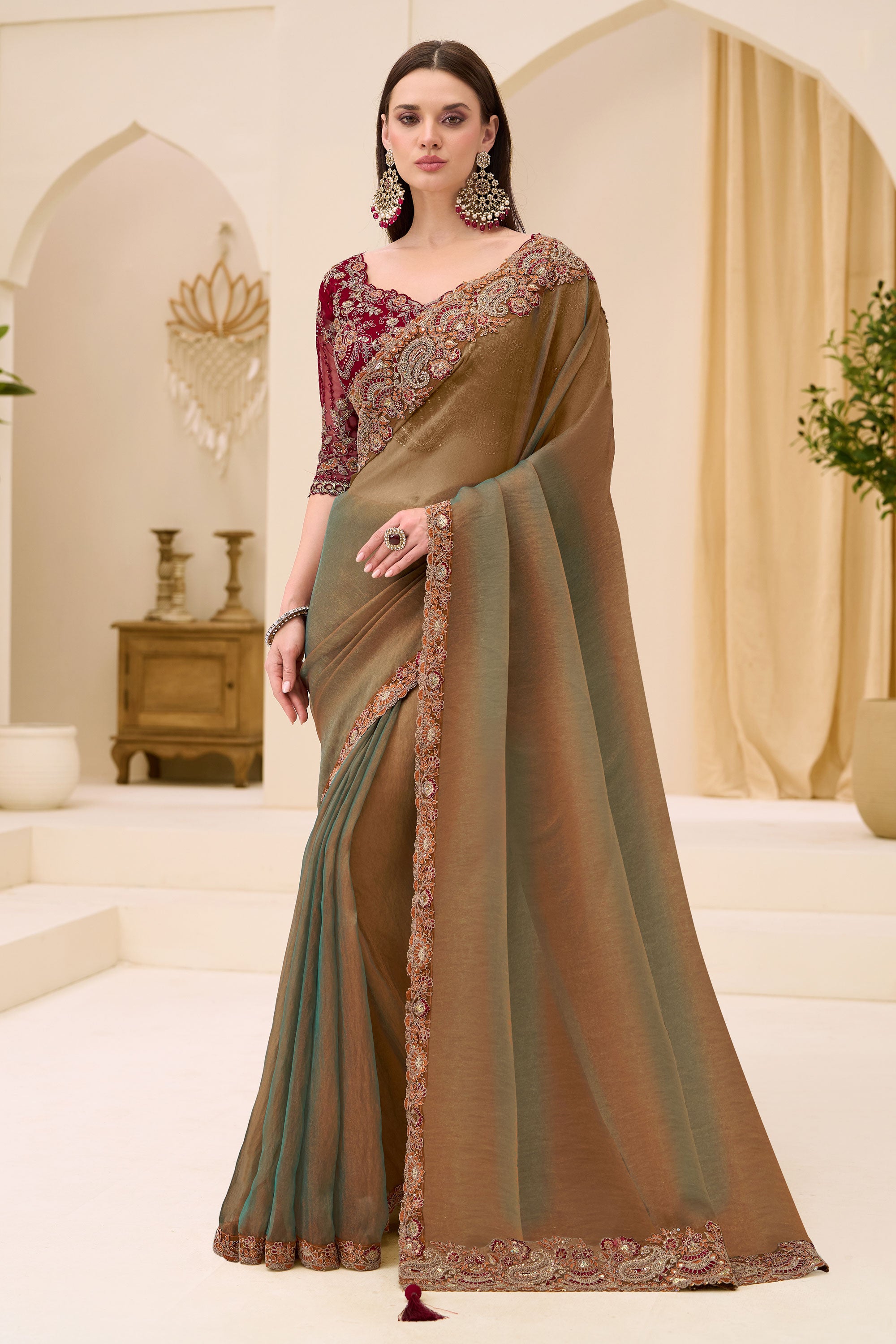Chic Brown Tissue Georgette Saree With Fancy Border Work