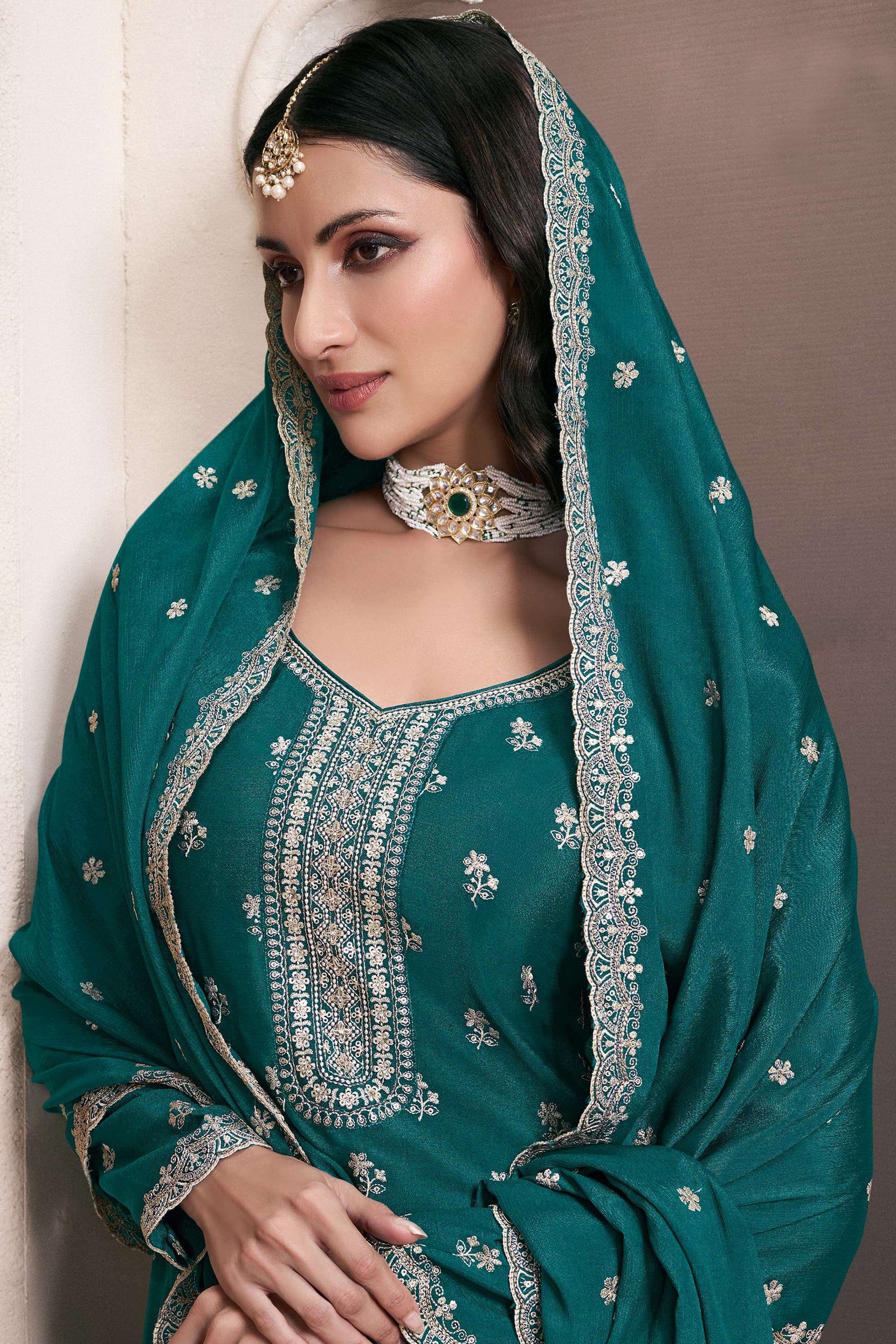Chinon Embroidered Dark Cyan Designer Readymade Palazzo Salwar Kameez
