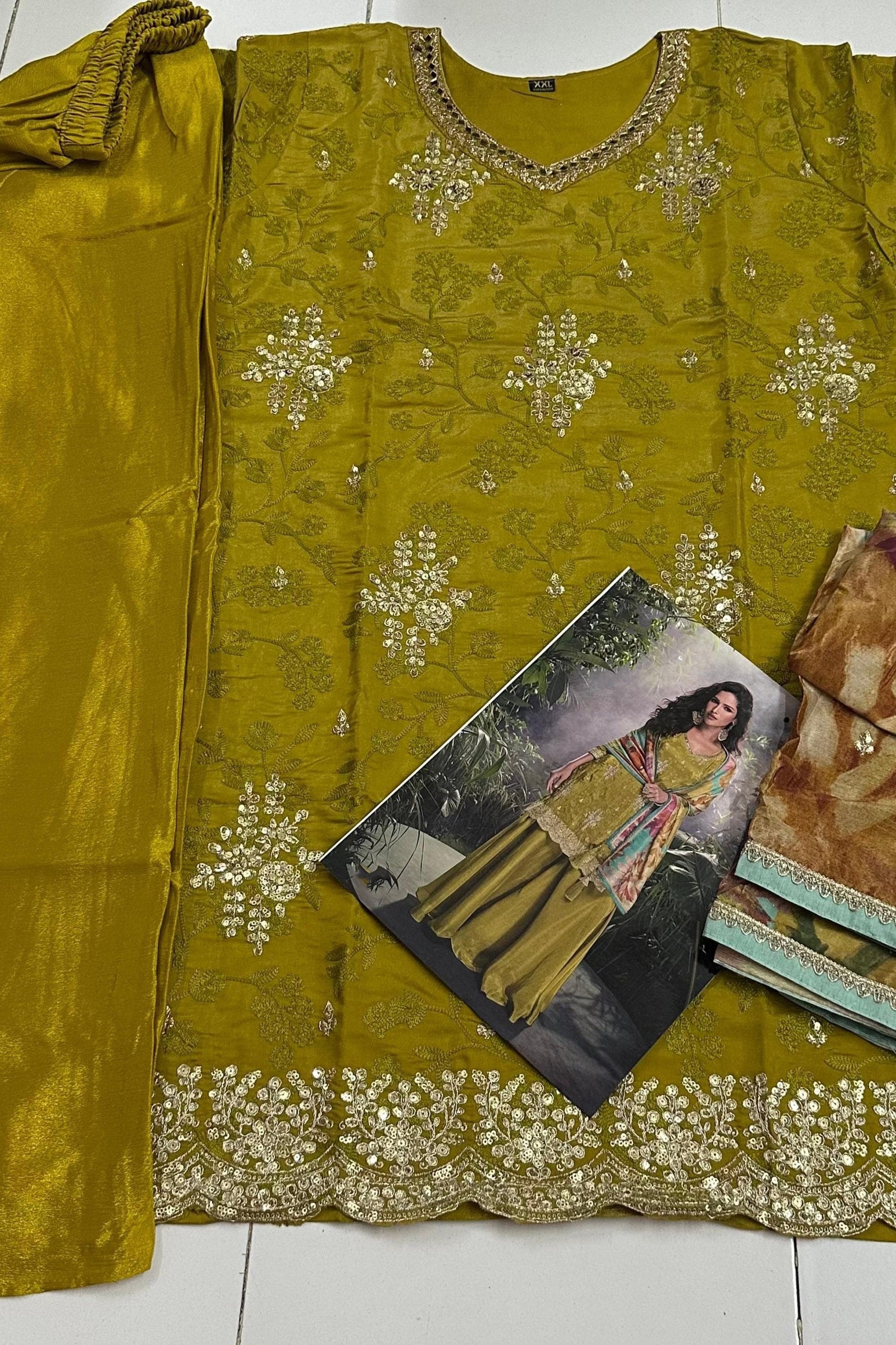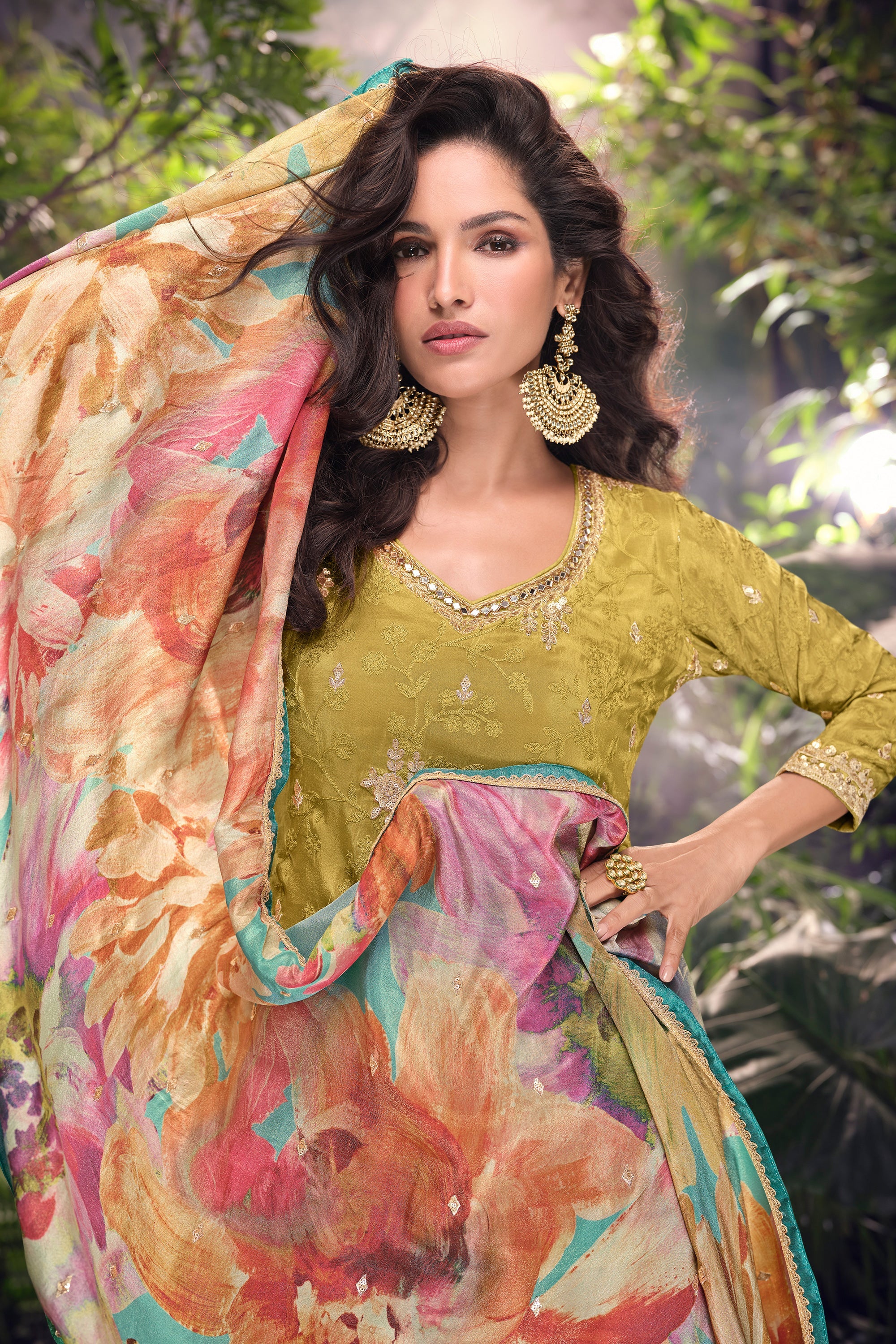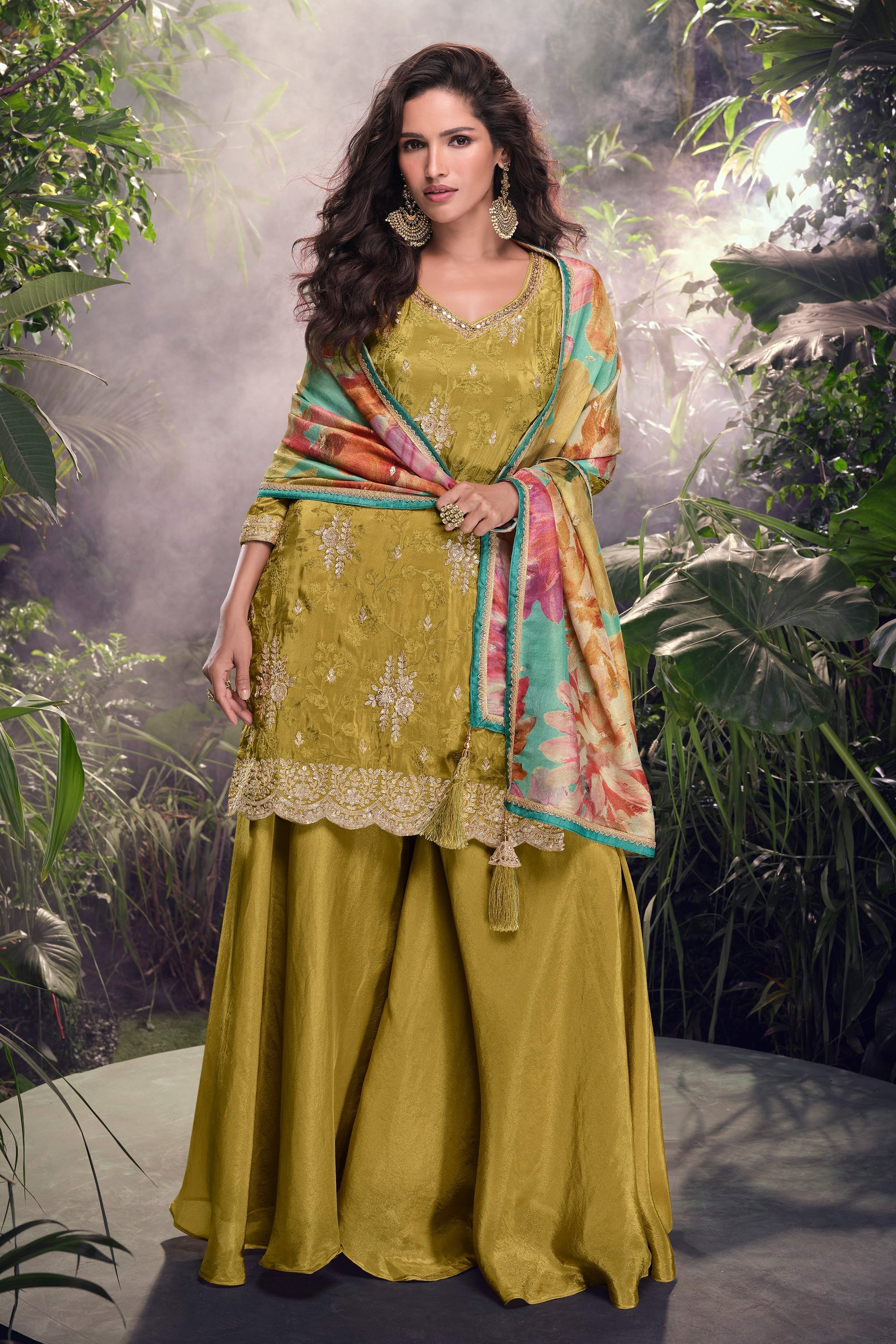 Chinon Embroidered Green Readymade Palazzo Salwar Suit With Dupatta