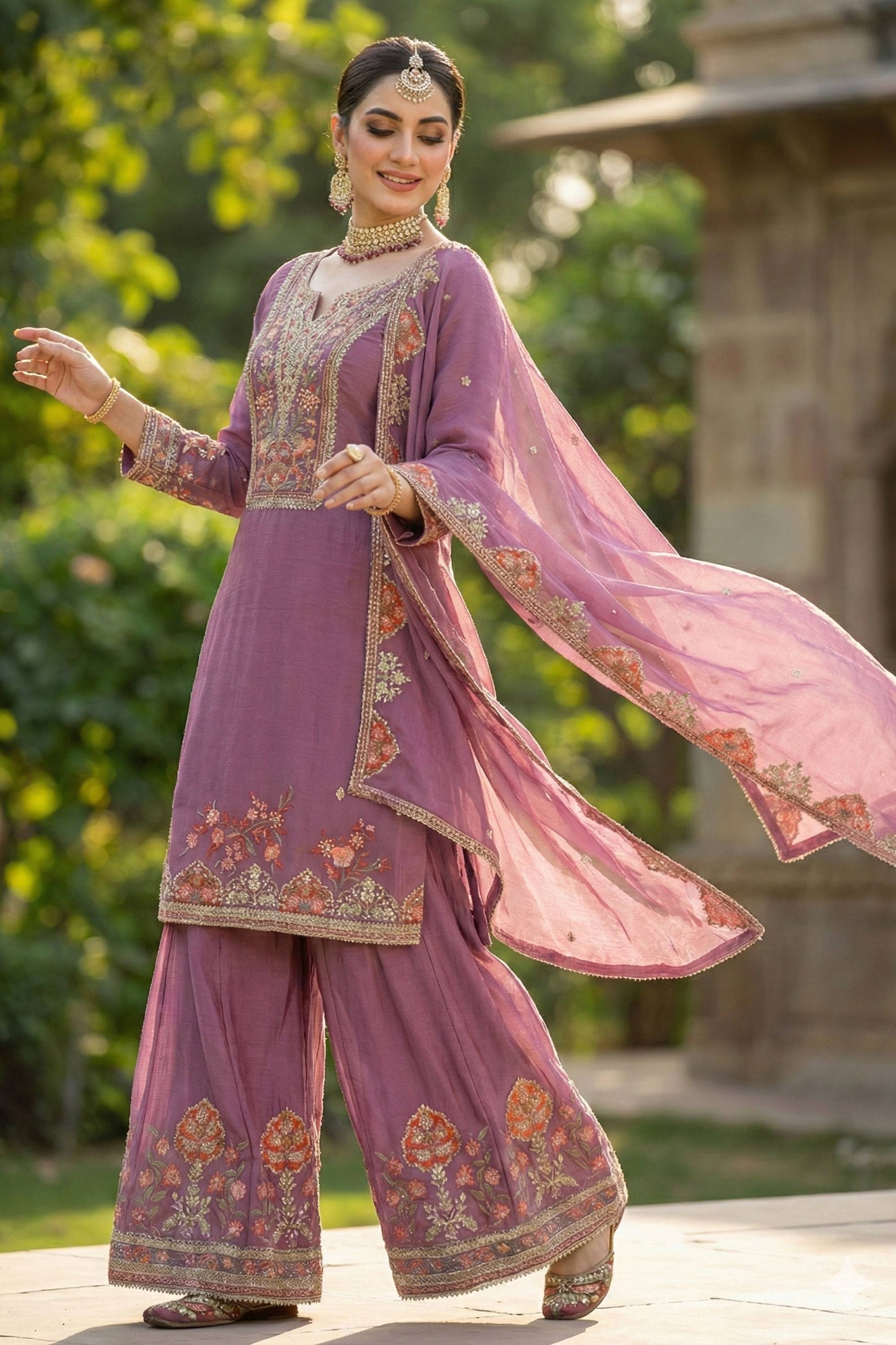 Chinon Embroidered Purple Festive Wear Palazzo Suit