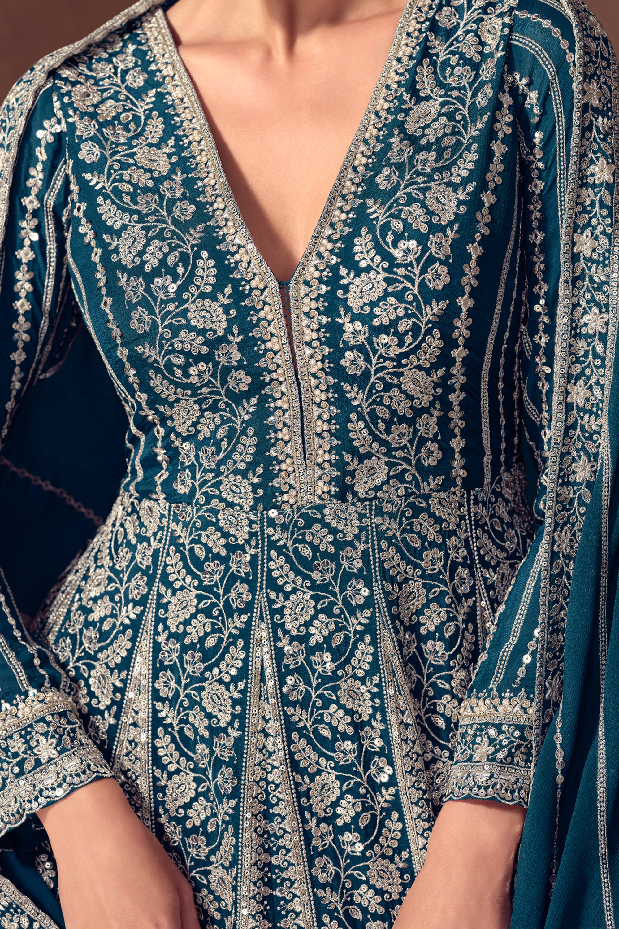 Chinon Embroidered Teal Designer Readymade Floor Touch Gown With Dupatta For Party Wear