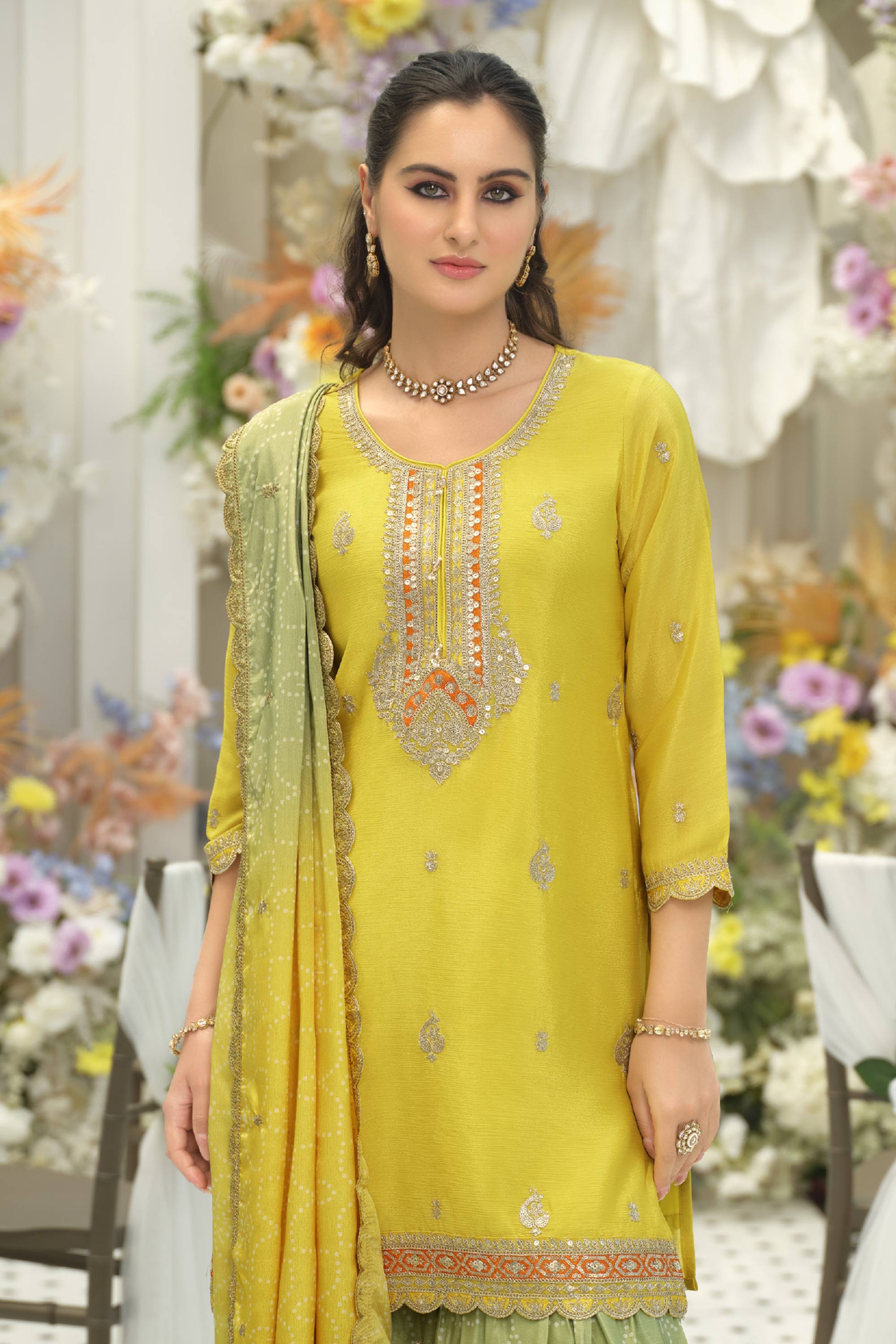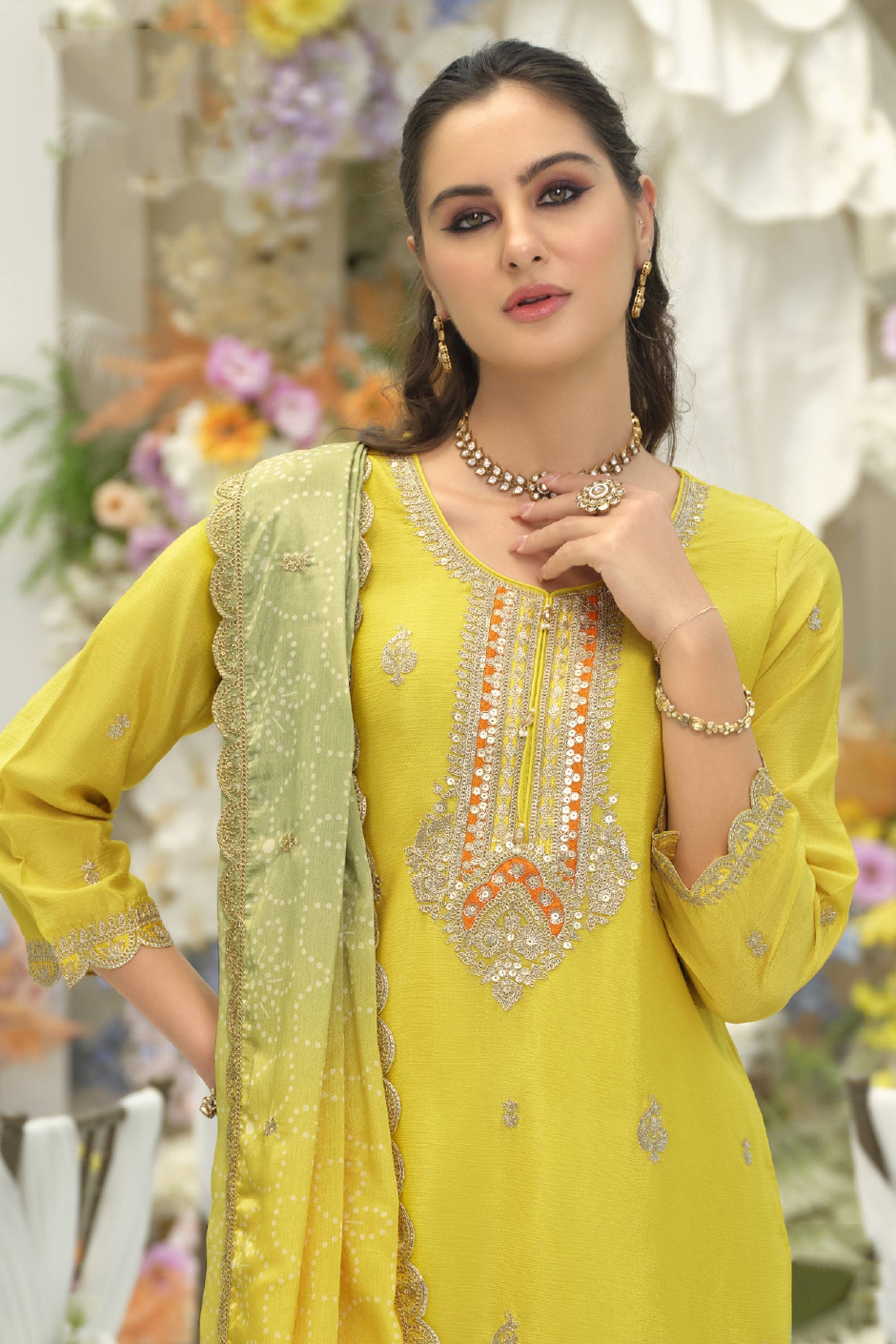 Chinon Embroidered Yellow Function Wear Readymade Palazzo Suit With Dupatta