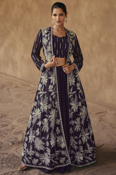 Chinon Fabric Embroidered Purple Color Readymade Indo Western Lehenga Choli With Long Shrug