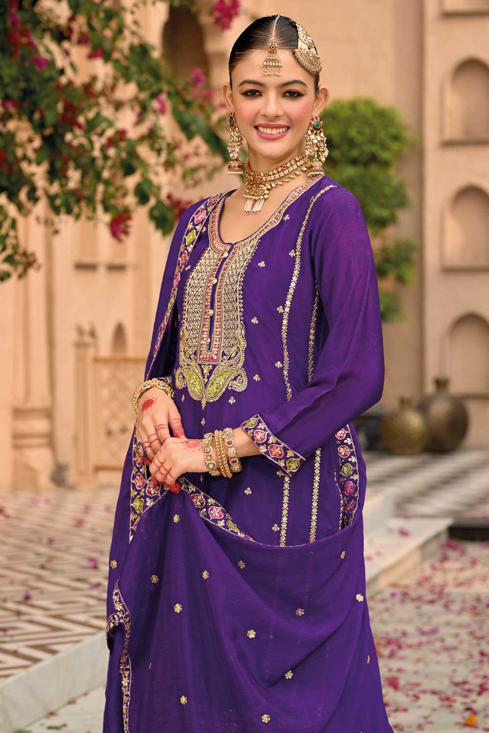 Elevate your festive style with this elegant Palazzo suit crafted from Heavy Chinon fabric. Featuring an embroidered top (40” length), flowy Palazzo bottoms, and a matching dupatta, it’s perfect for festivals, functions, and Eid celebrations. Note: Slight color variations may occur due to digital photography.