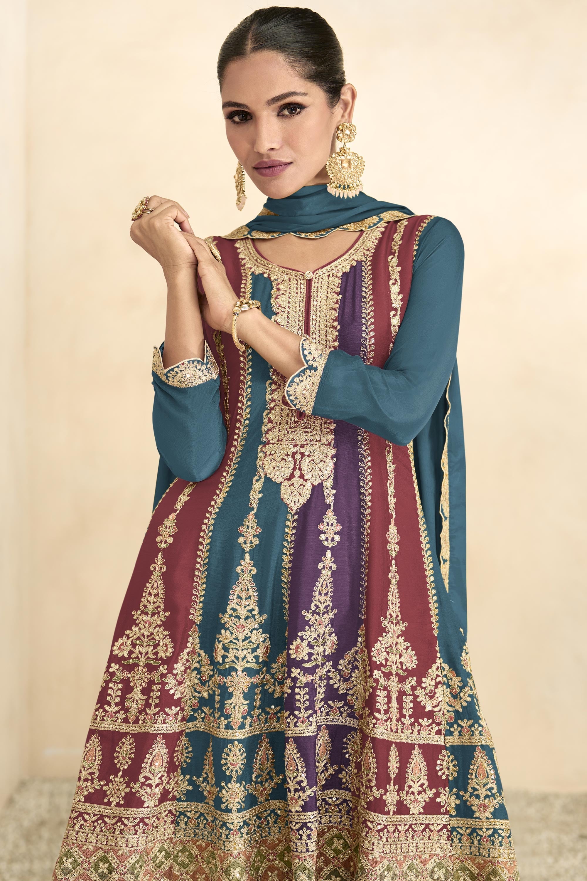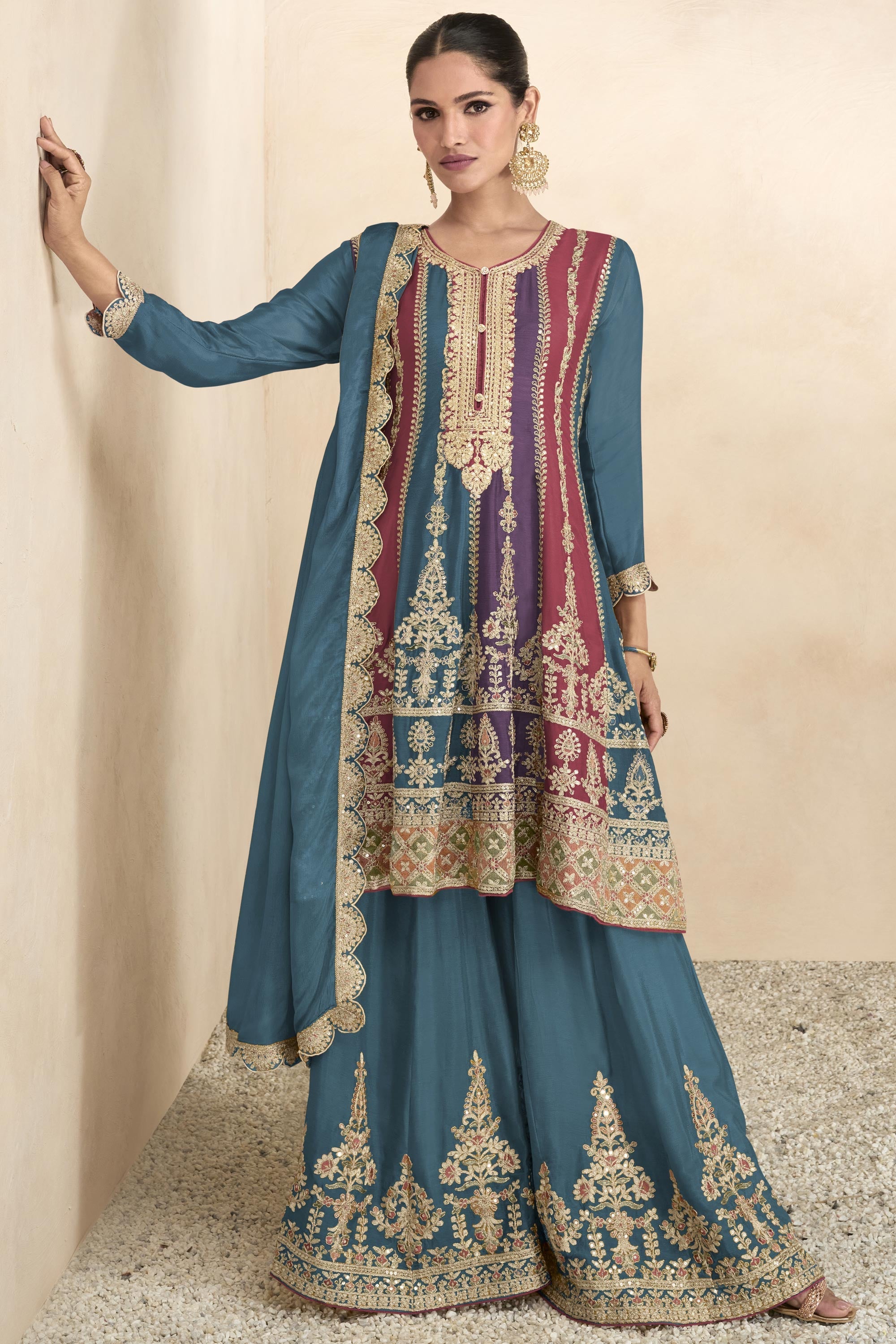 Chinon Fabric Teal Color Embroidered Readymade Pakistani Palazzo Suit