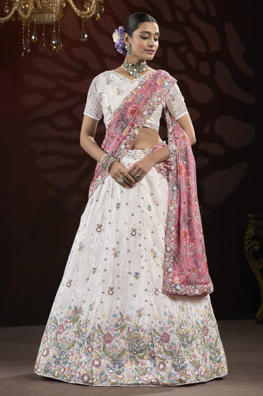 Chinon Sangeet Wear Lehenga Choli With Sequins Work In Off White Color