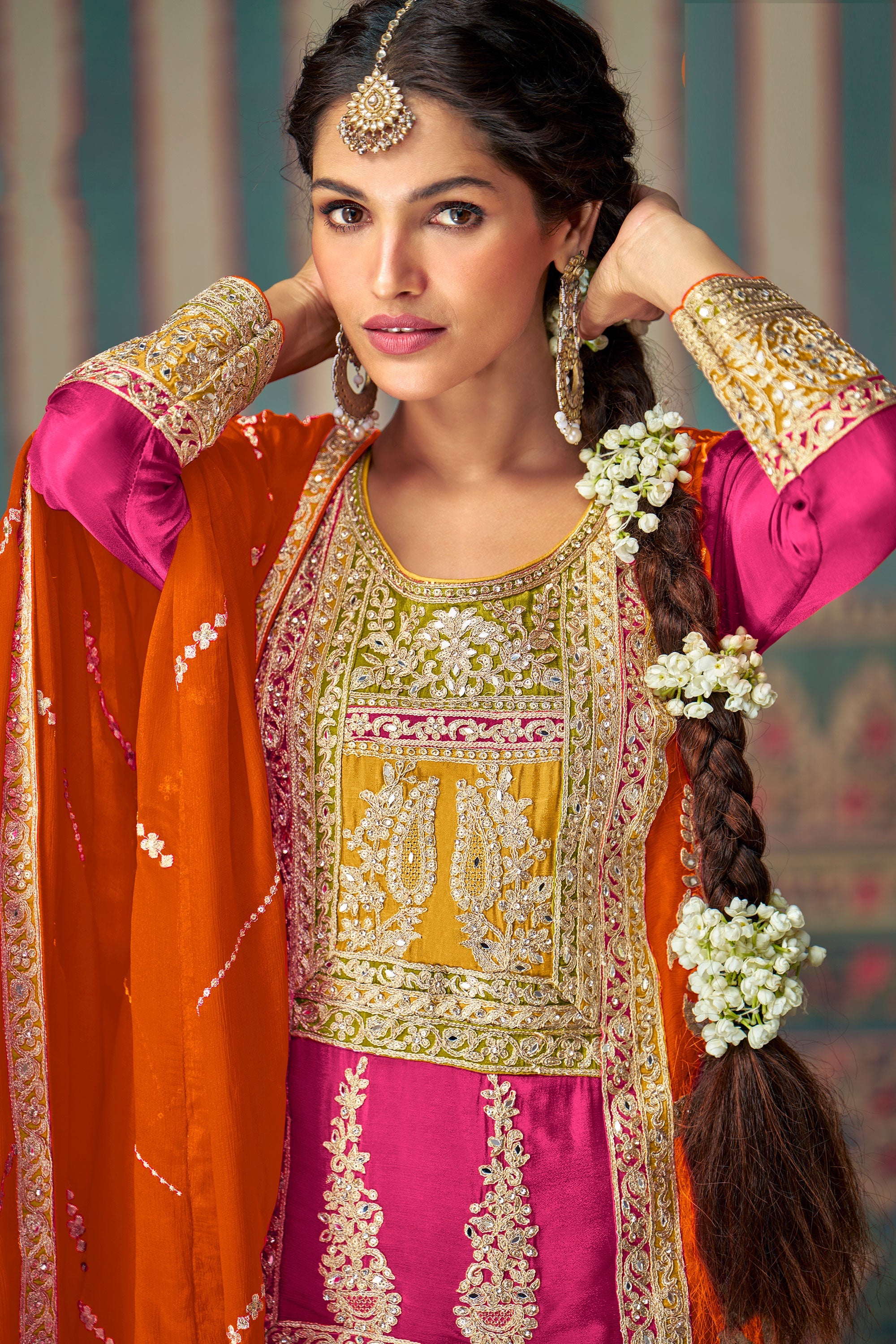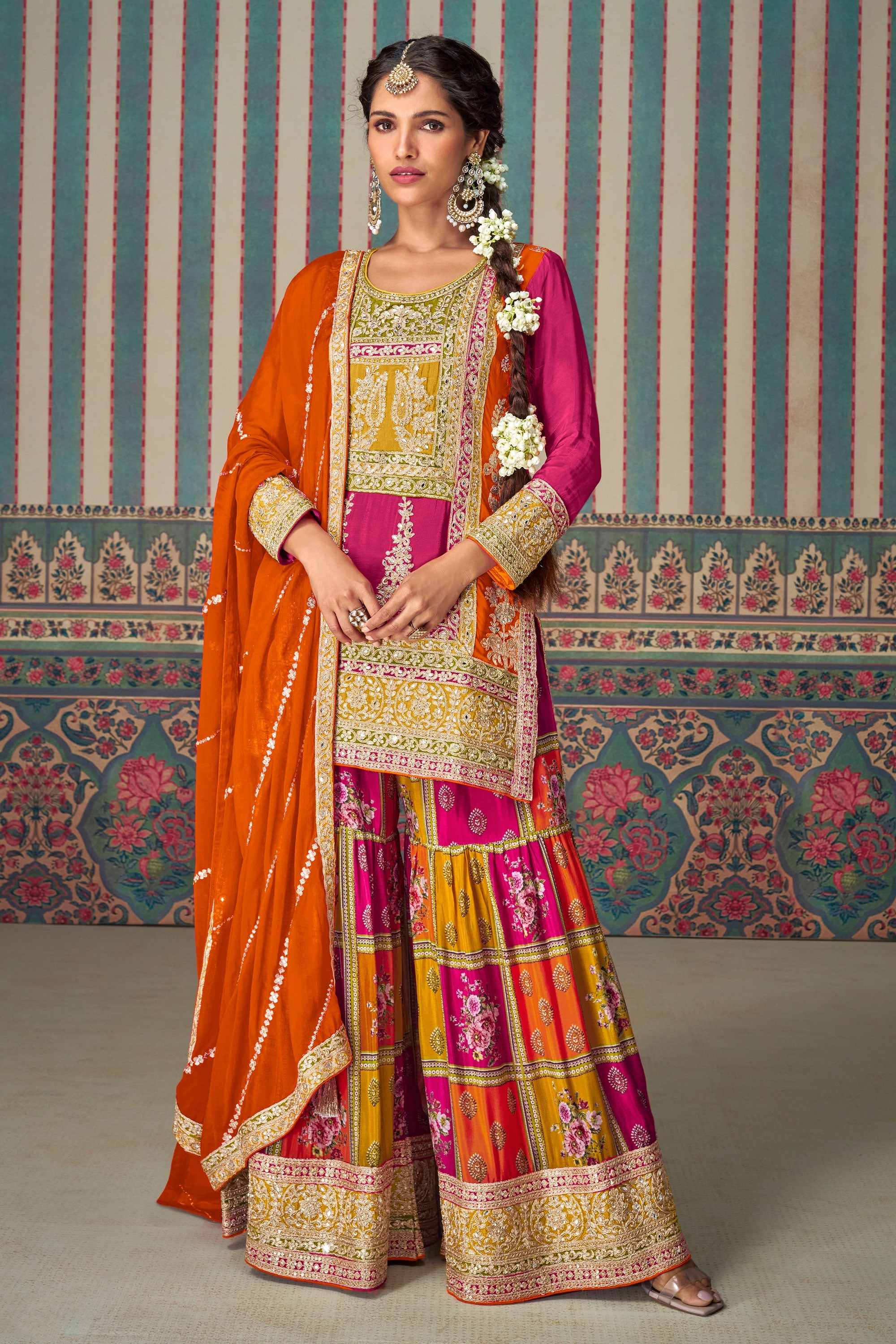 Discover the allure of traditional fashion with our Chinon Silk Embroidered Readymade Sharara Style Palazzo Salwar Suit. This elegant attire is crafted from high-quality Chinon silk and adorned with exquisite embroidery, showcasing delicate floral patterns. The readymade suit ensures a comfortable and hassle-free experience while making you look effortlessly stylish. Ideal for weddings, festivals, and special occasions, this sharara suit combines classic charm with modern flair. Elevate your ethnic wardrobe and leave a lasting impression with this beautifully designed outfit.