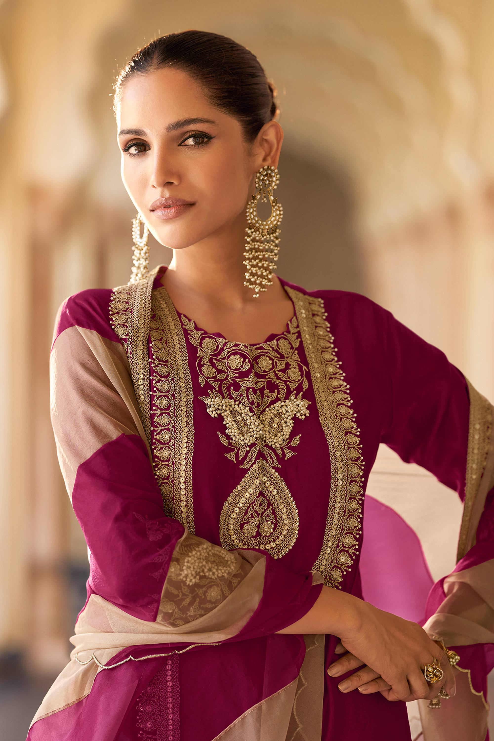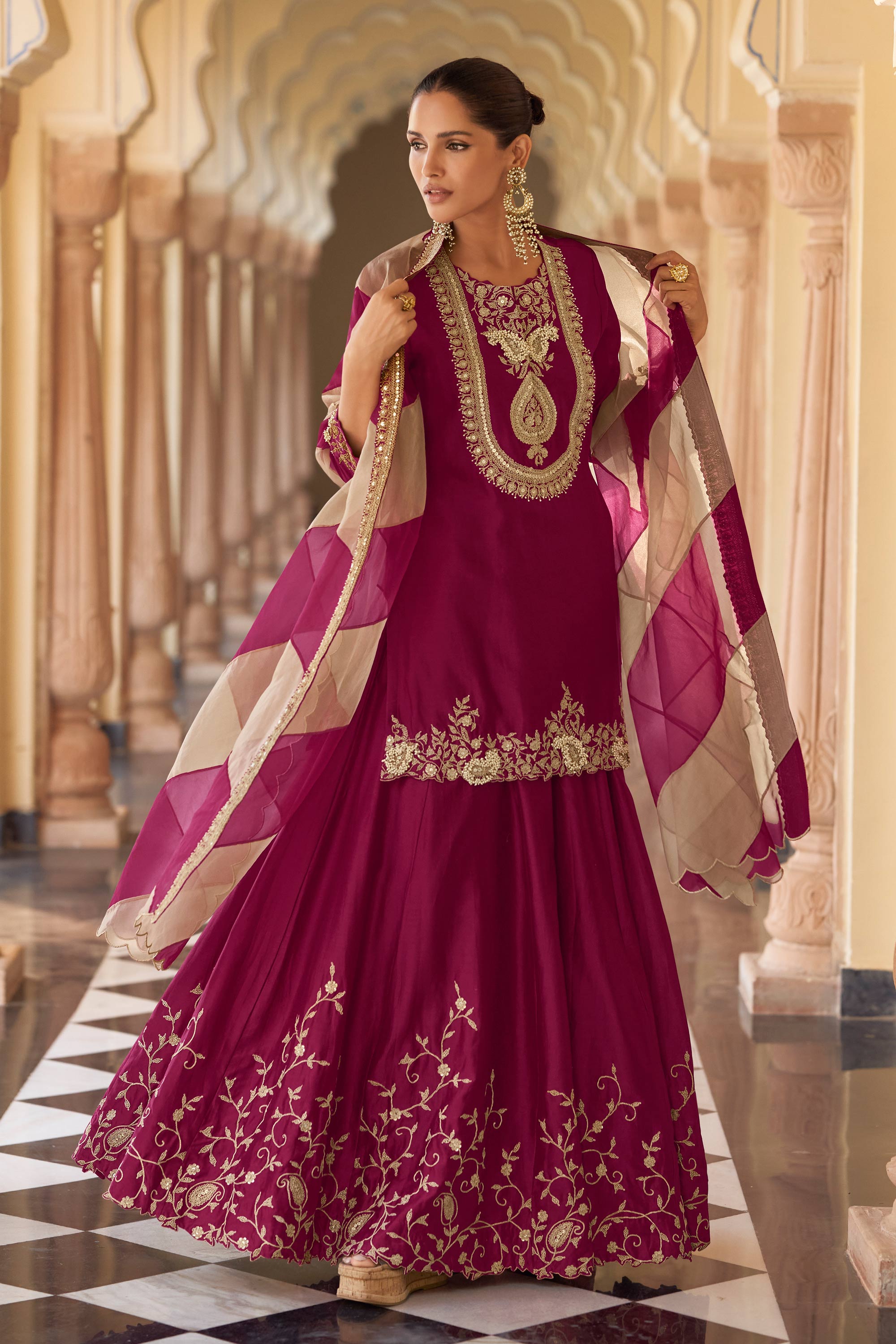Chinon Silk Embroidered Wine Festive Wear Readymade Sharara Style Salwar Suit