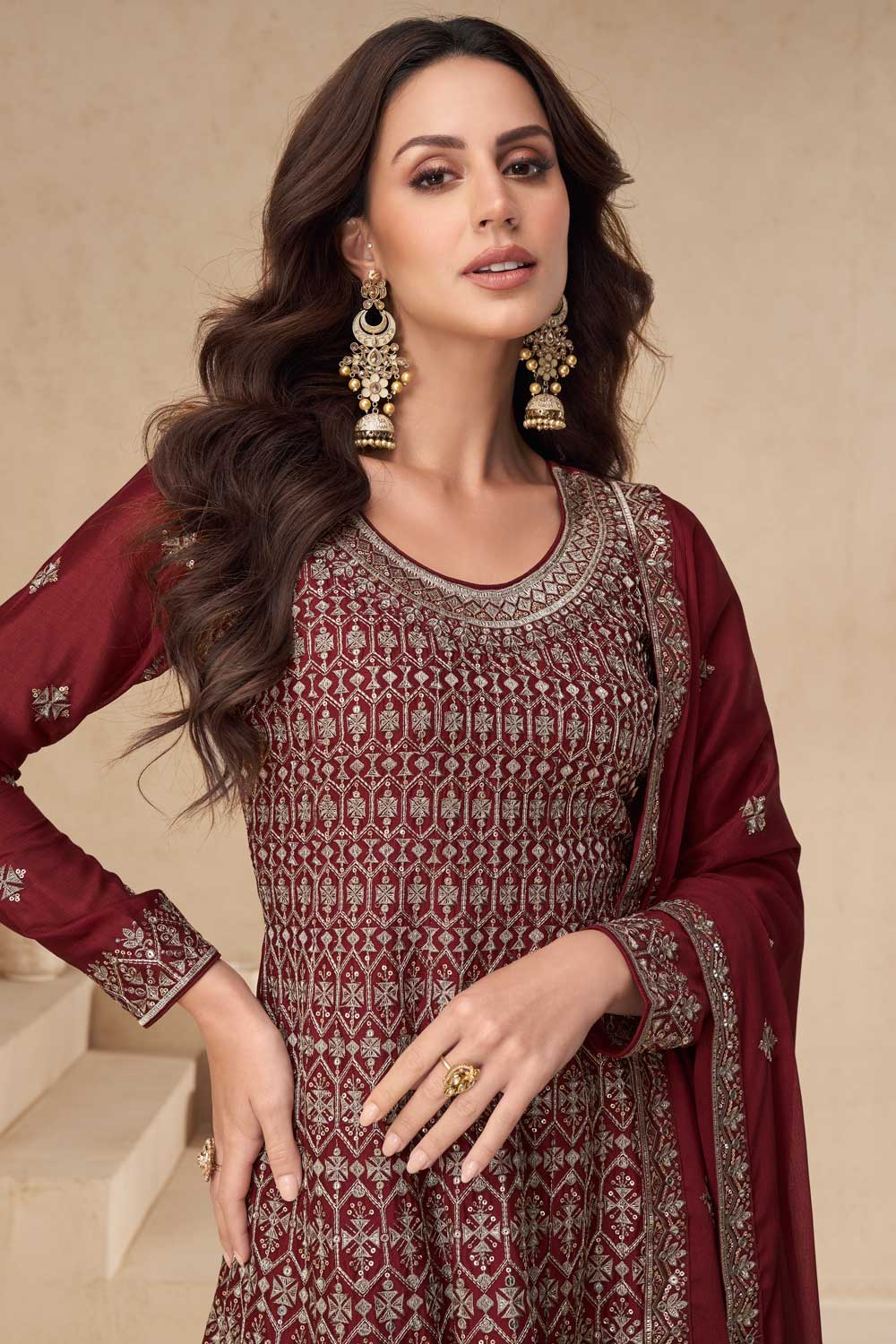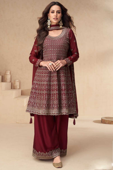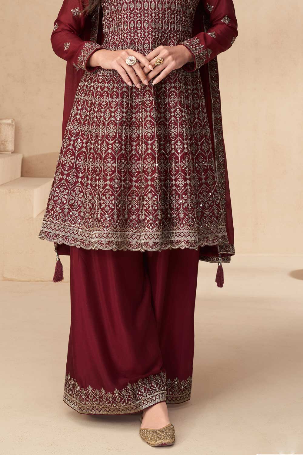 Chinon Silk Fabric Maroon Color Attractive Palazzo Suit