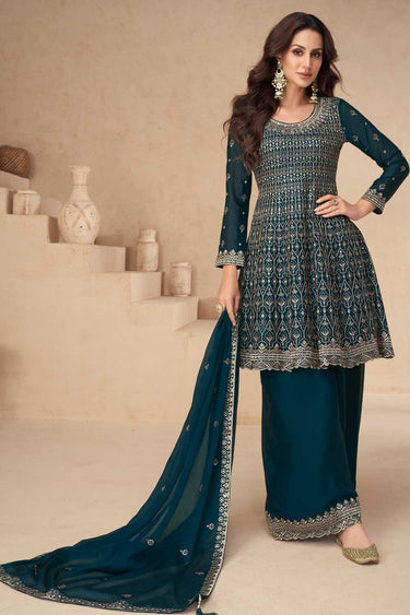 Chinon Silk Fabric Teal Color Glamorous Palazzo Suit