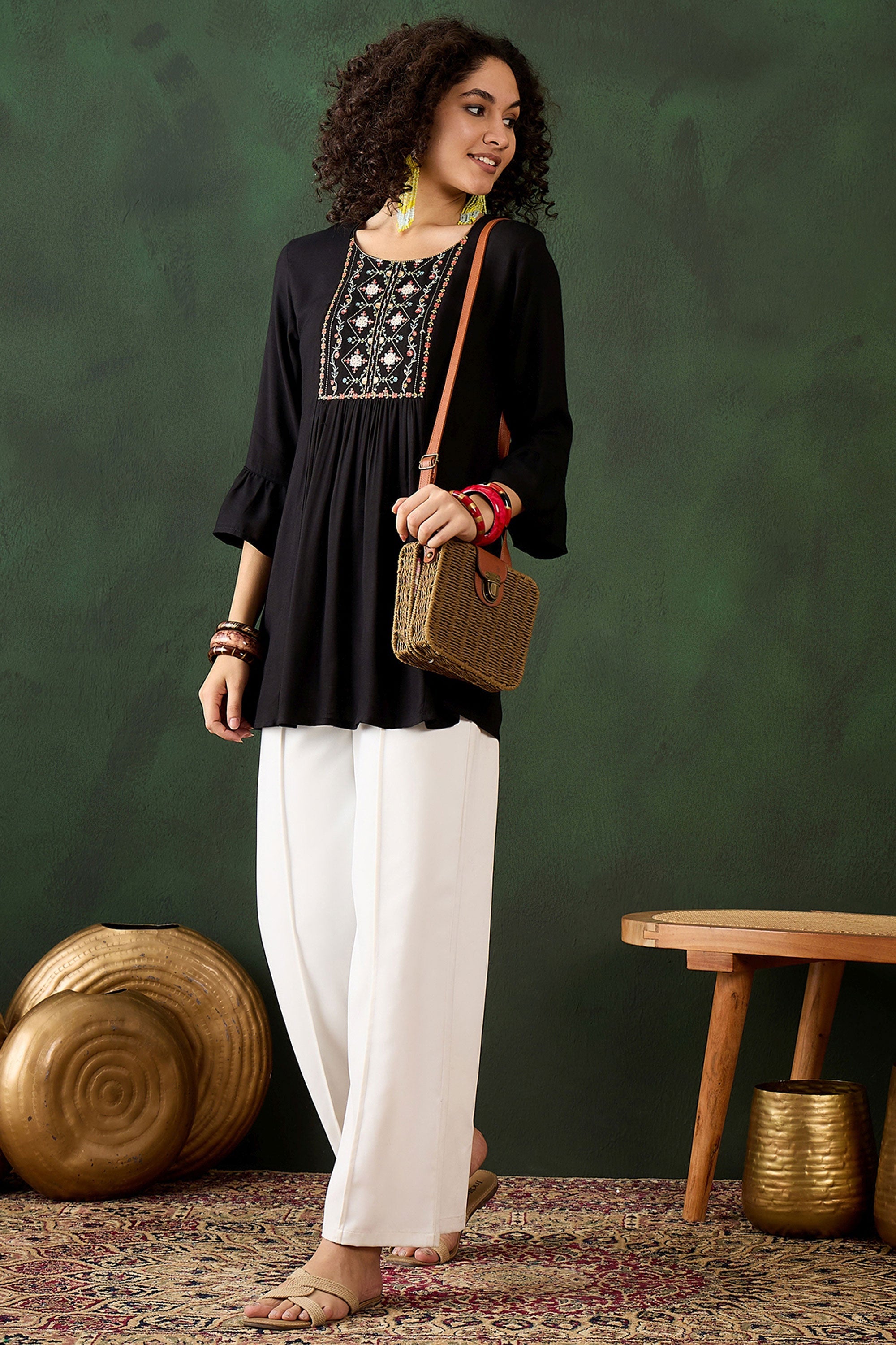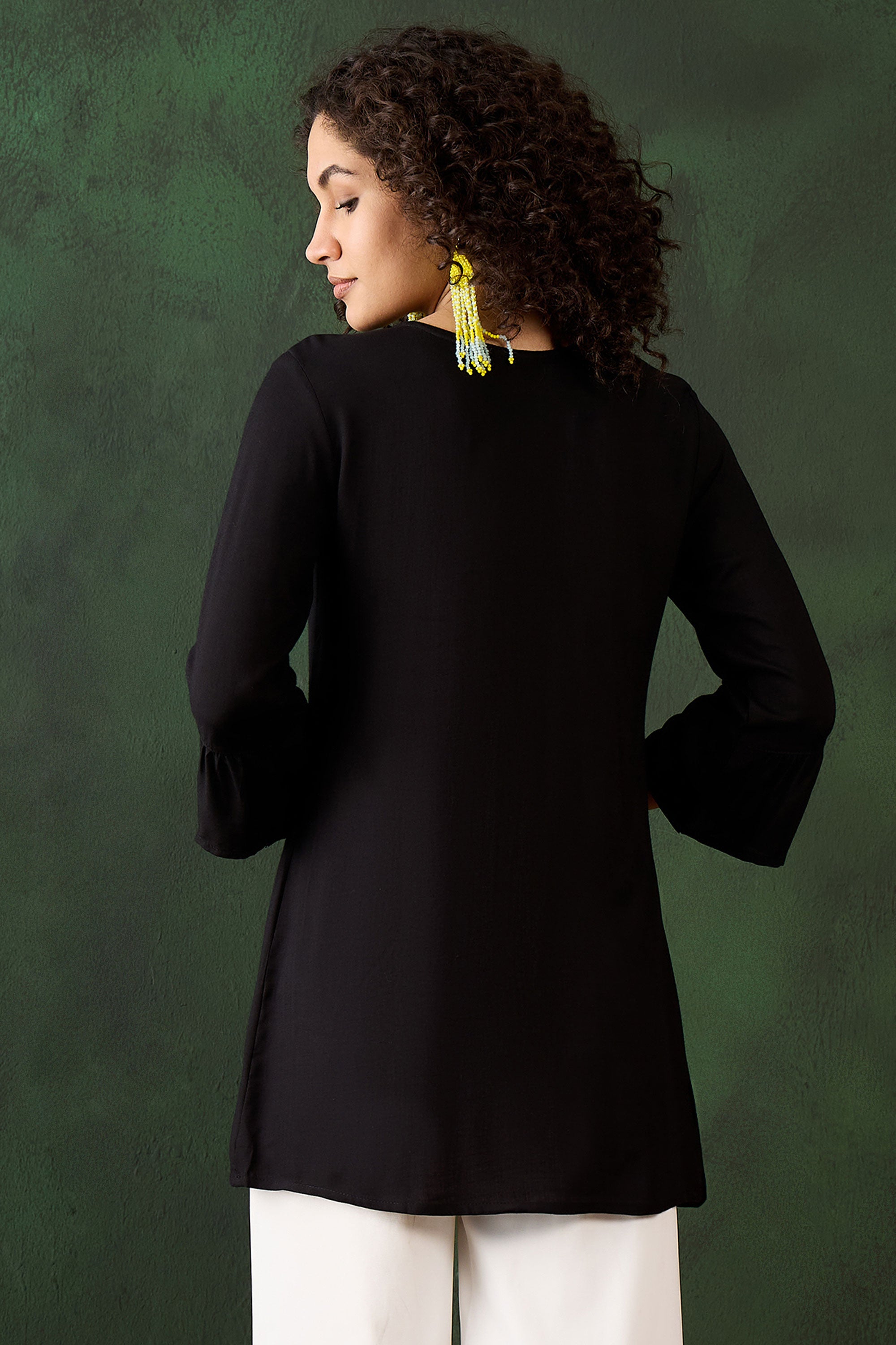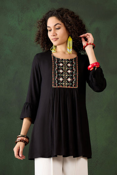 Classic Embroidered Work On Black Color Short Kurti In Rayon Fabric