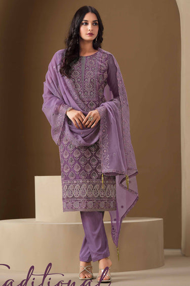 Classic Purple Embroidered Straight Cut Dress In Chiffon Fabric