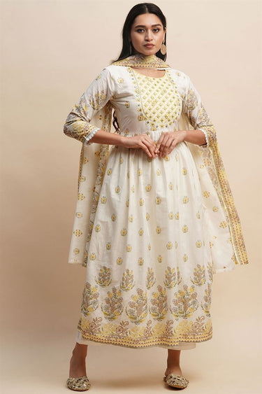 Comfortable Printed Salwar Suit in White and Yellow Color Cotton Fabric