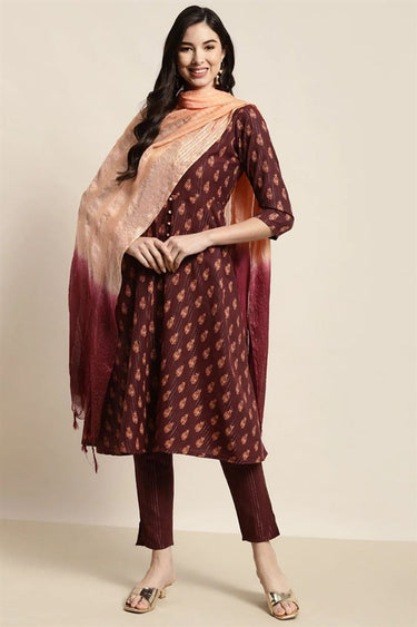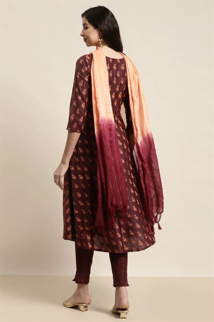 Cotton Fabric Adorming Top Bottom Dupatta Set In Maroon Color