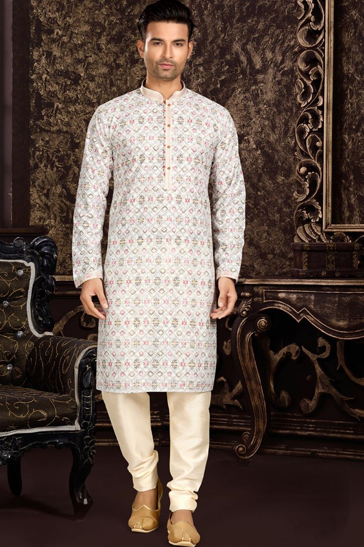 Cotton Fabric Brilliant Digital Printed Kurta Pyjama In Cream Color