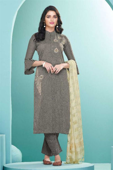 Cotton Fabric Grey Color Elegant Salwar Suit With Cream Dupatta