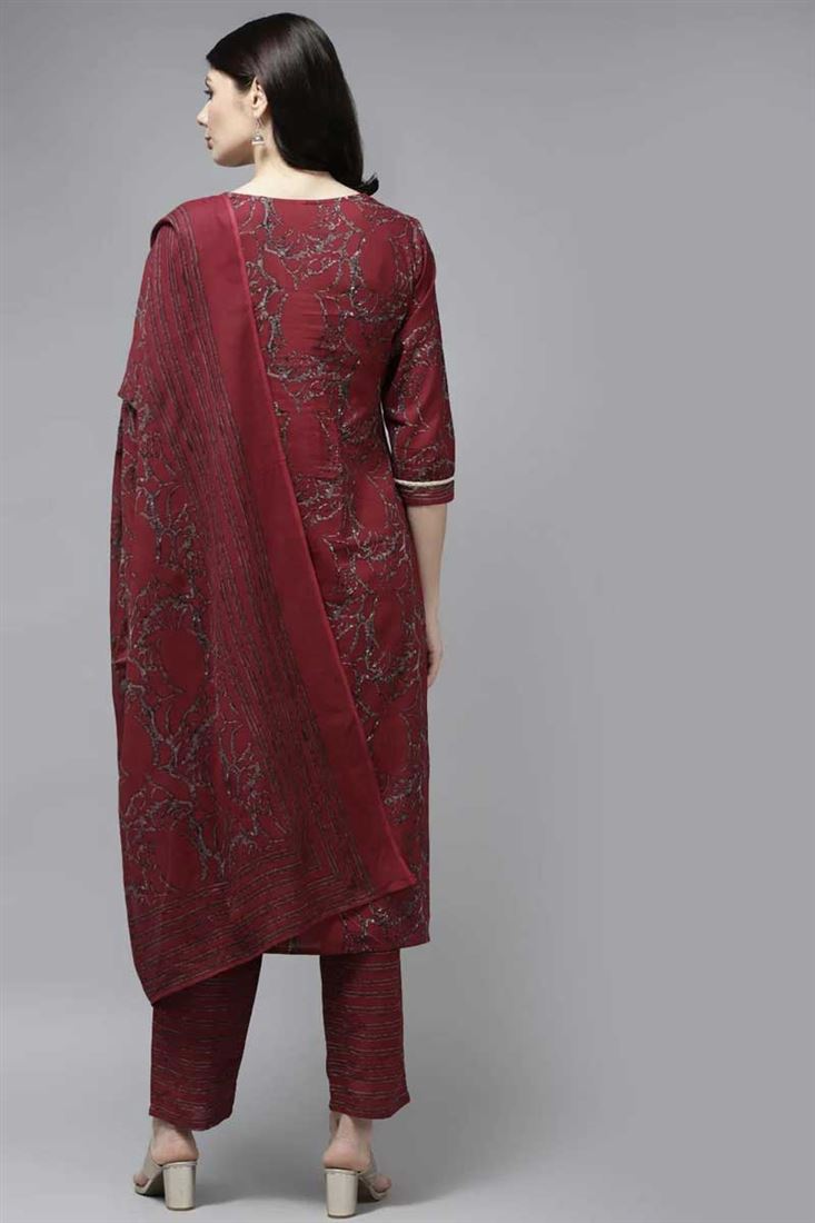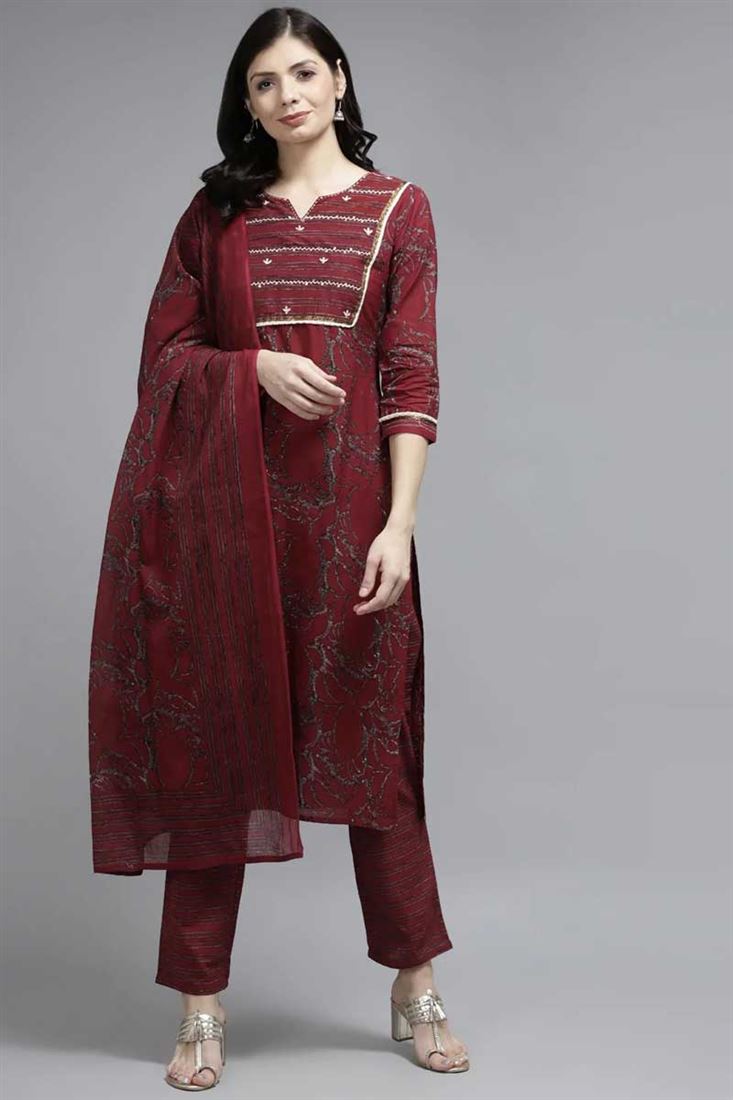 Cotton Fabric Printed Work Awesome Top Bottom Dupatta Set In Maroon Color