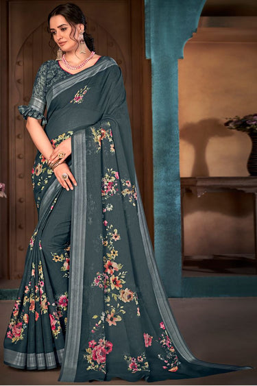 Cotton Linen Fabric Casual Wear Dark Grey Color Stunning Digital Printed Saree