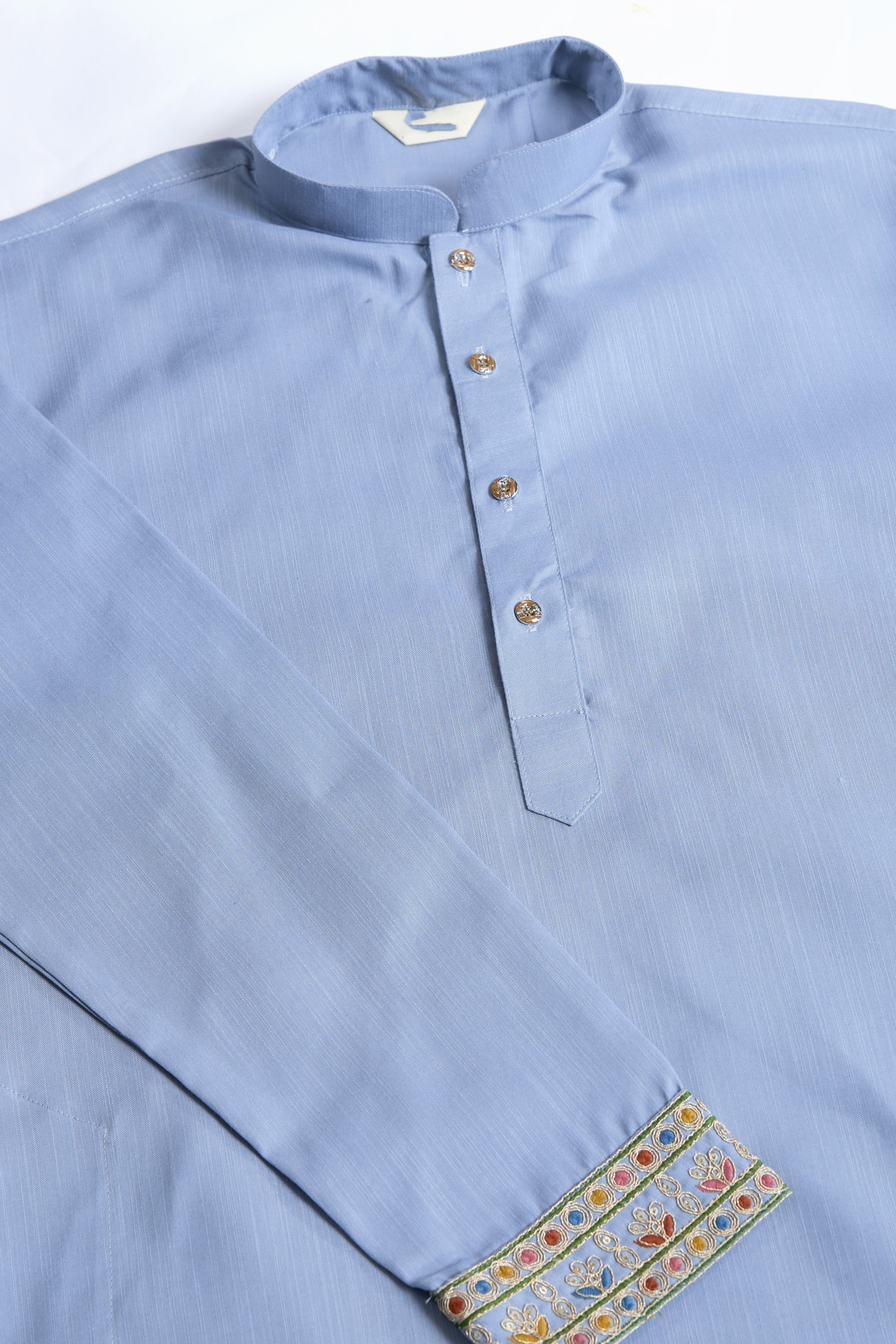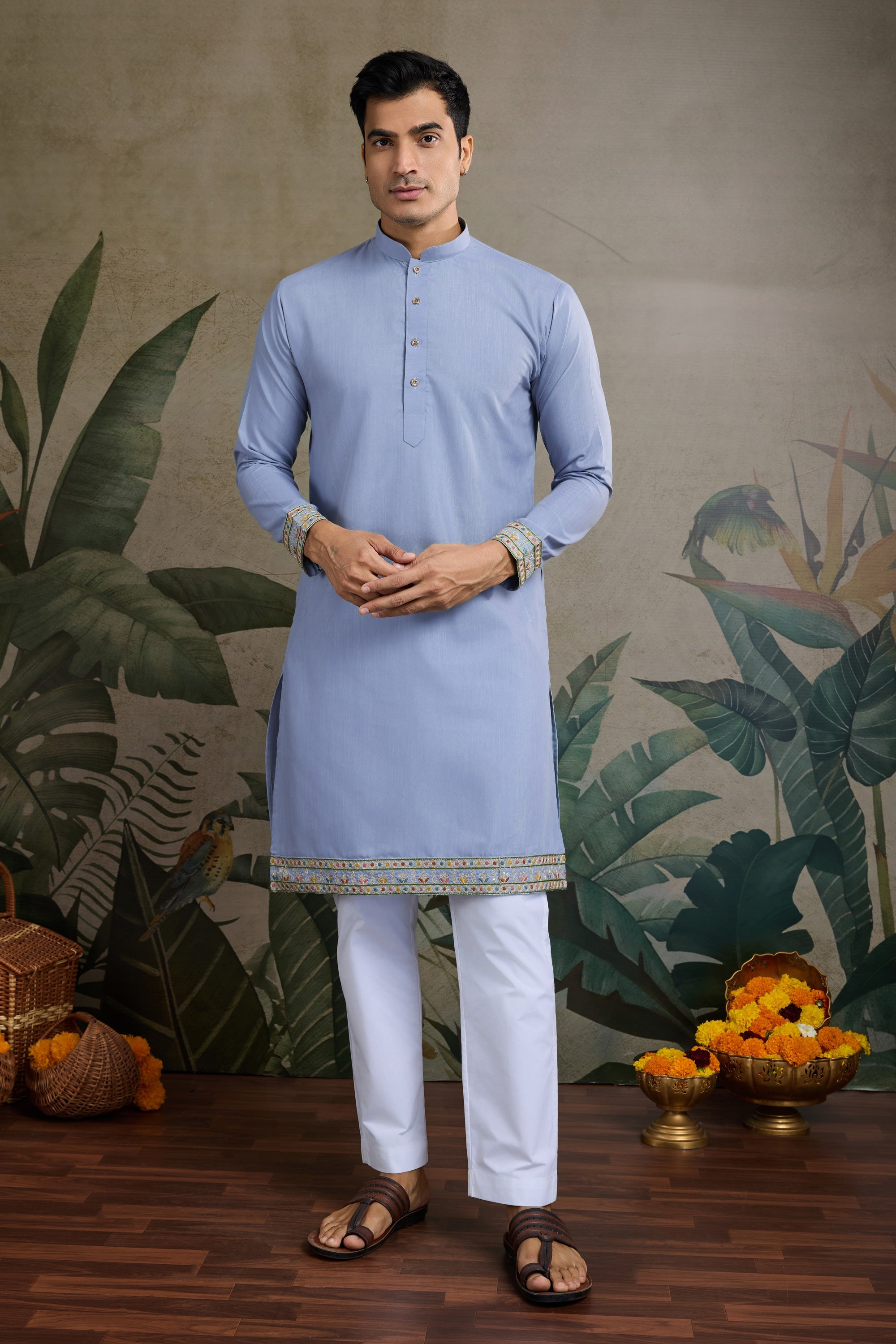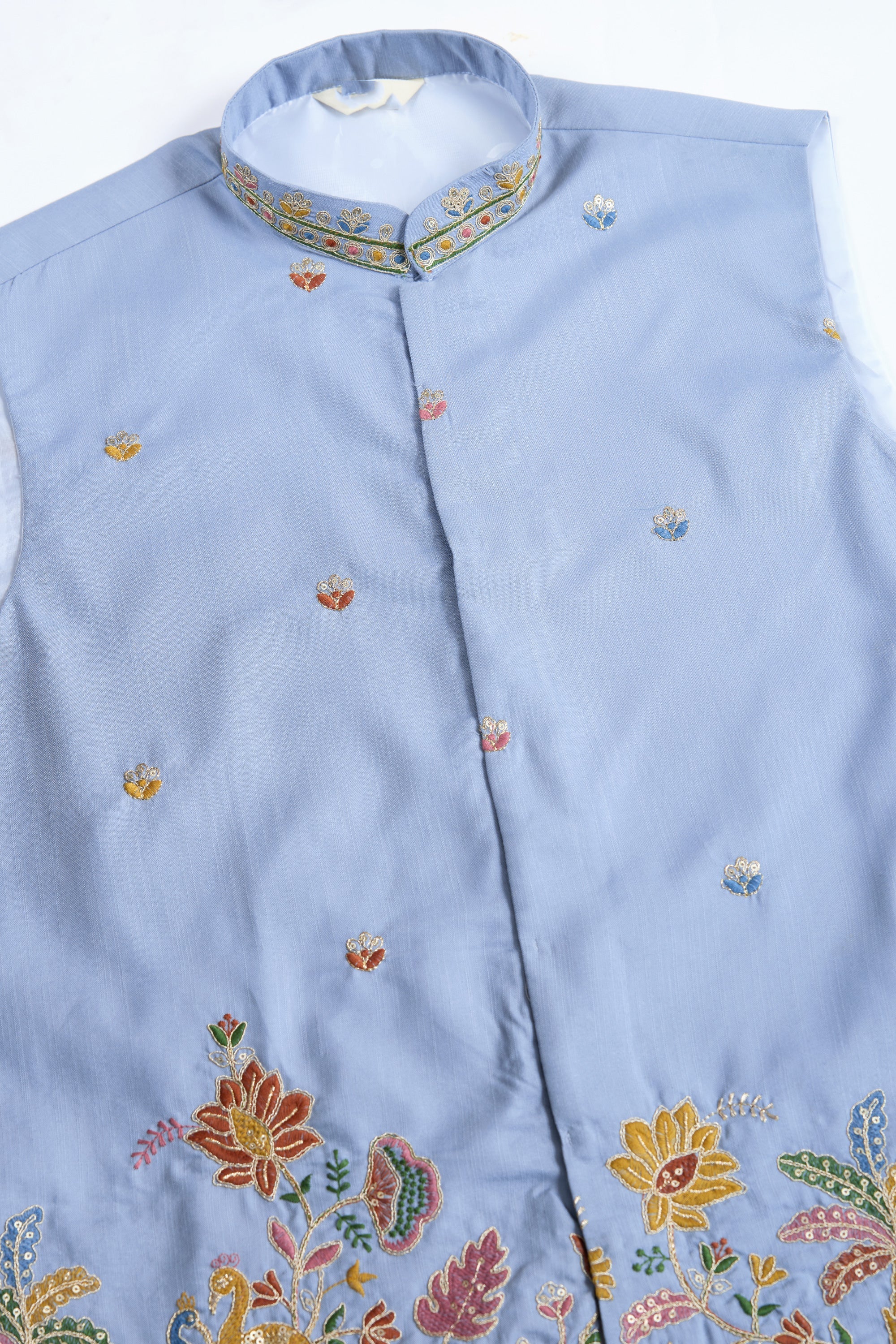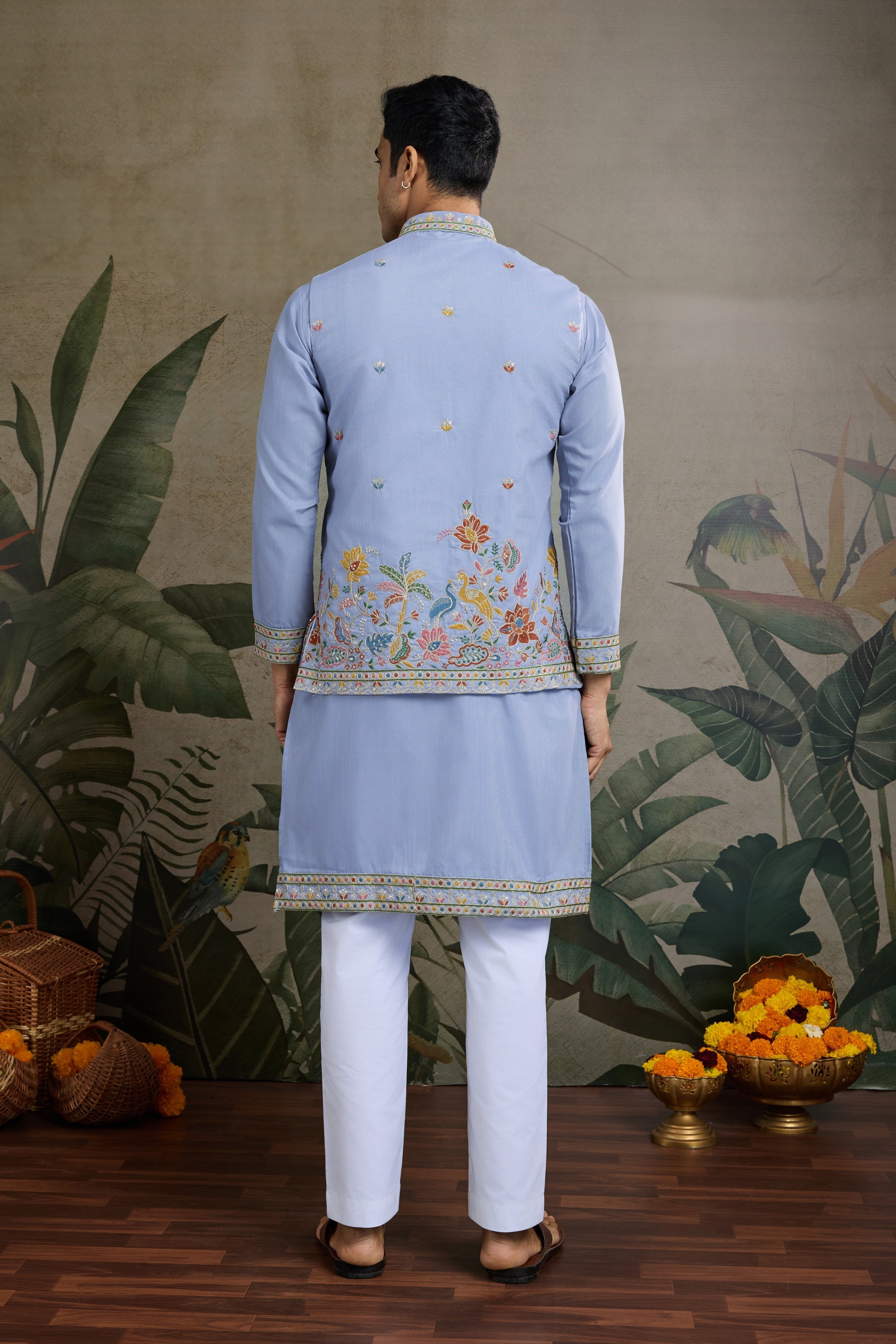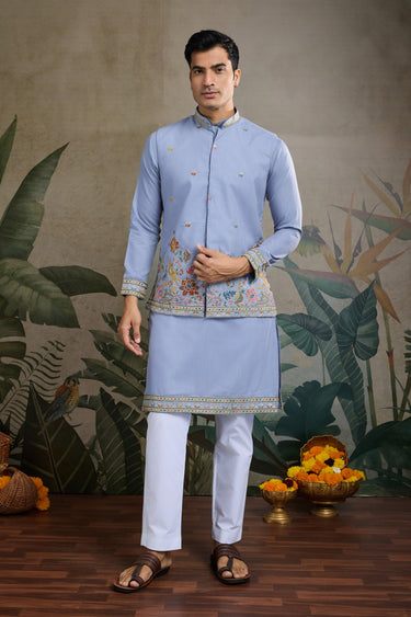 Cotton Sky Blue Festive Wear Attractive Readymade Men Kurta With Jacket