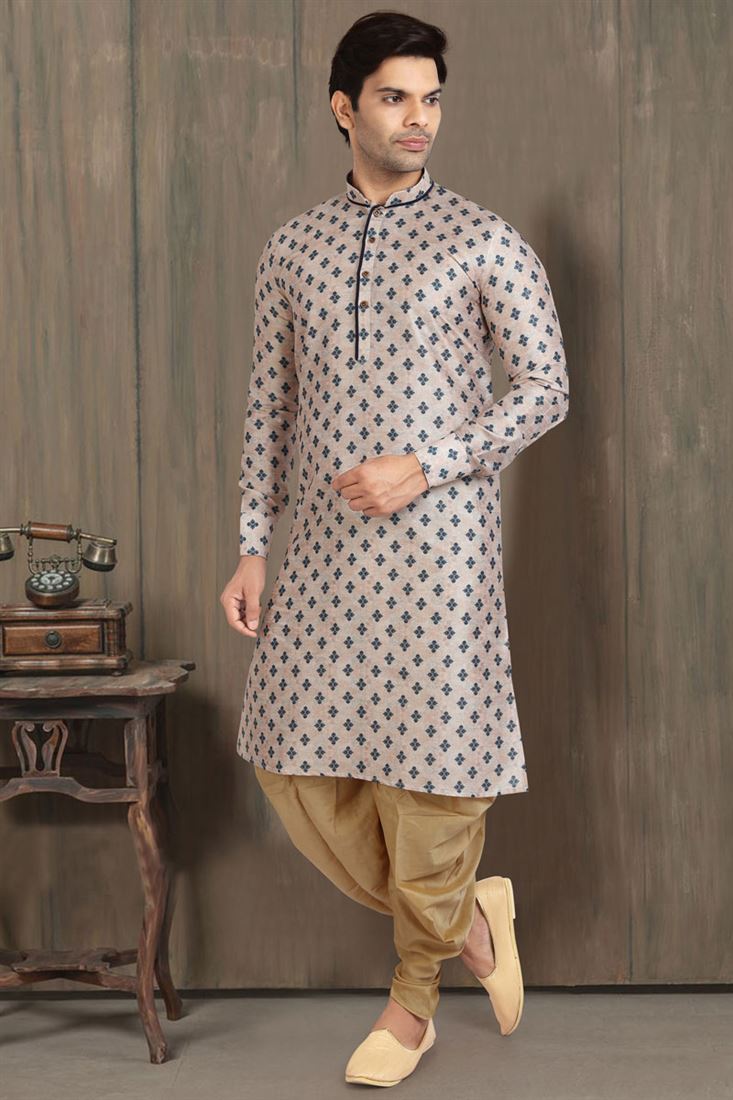 Cream Color Art Silk Fabric Sangeet Wear Elegant Printed Kurta Pyjama