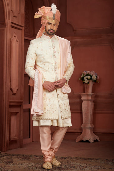 Cream Color Designer Pure Silk Fabric Readymade Sherwani For Men