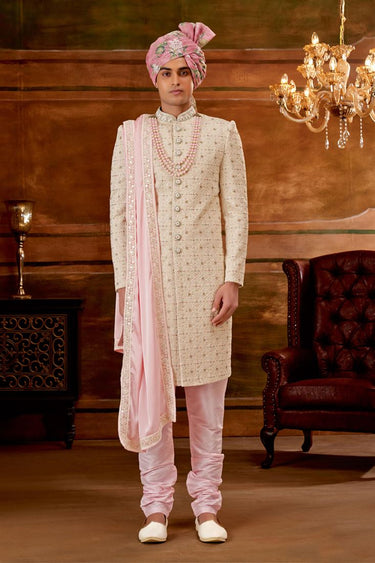 Cream Color Silk Fabric Wedding Wear Readymade Heavy Embroidered Groom Sherwani For Men With Stole