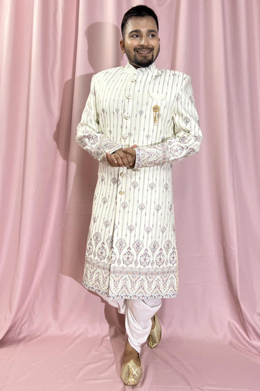 Cream Color Silk Fabric Wedding Wear Readymade Sherwani For Men