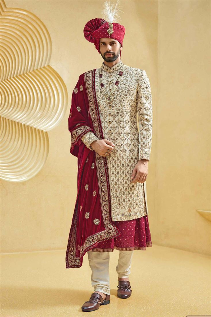 Cream Fancy Fabric Heavy Embroidered Designer Indowestern Groom Sherwani