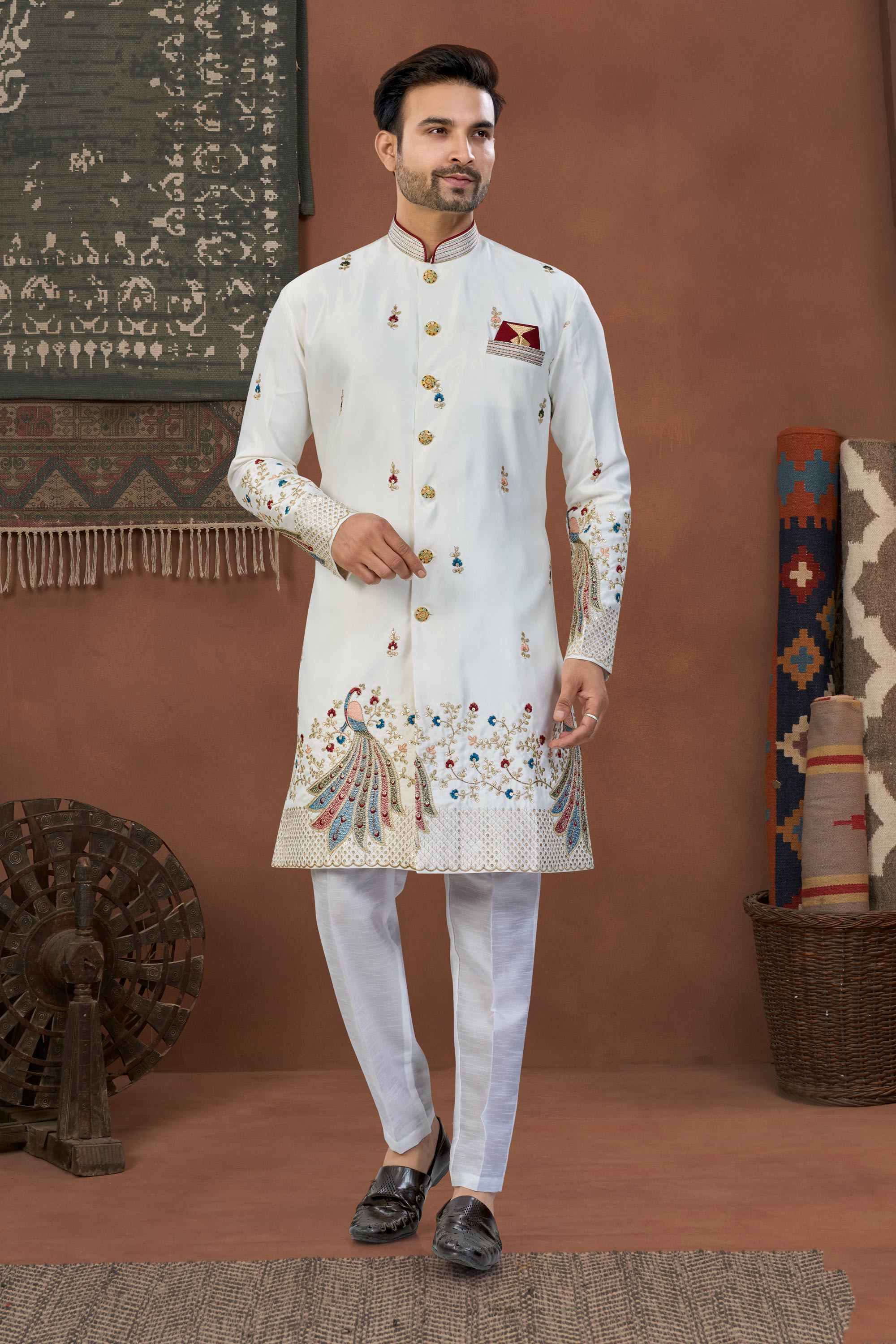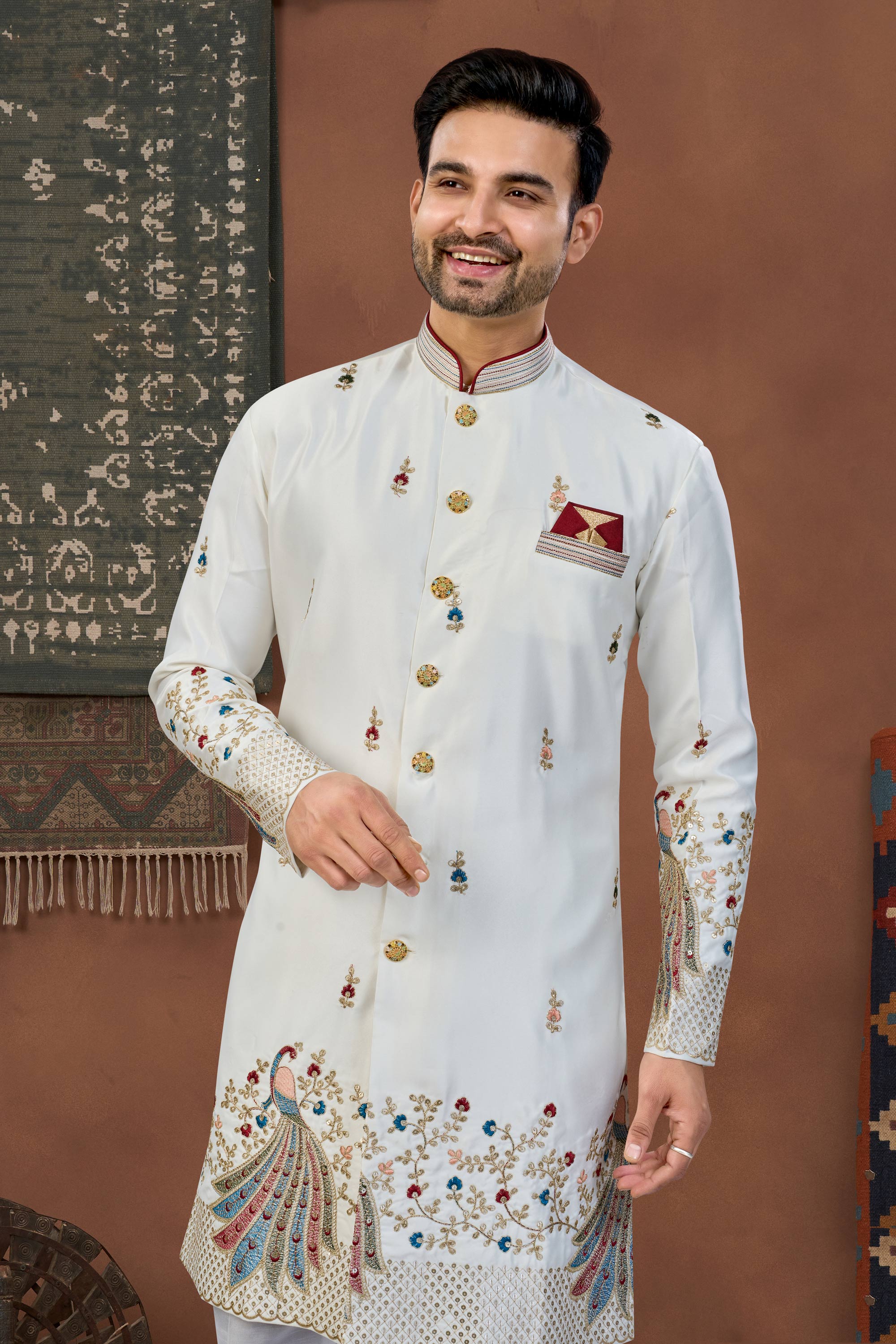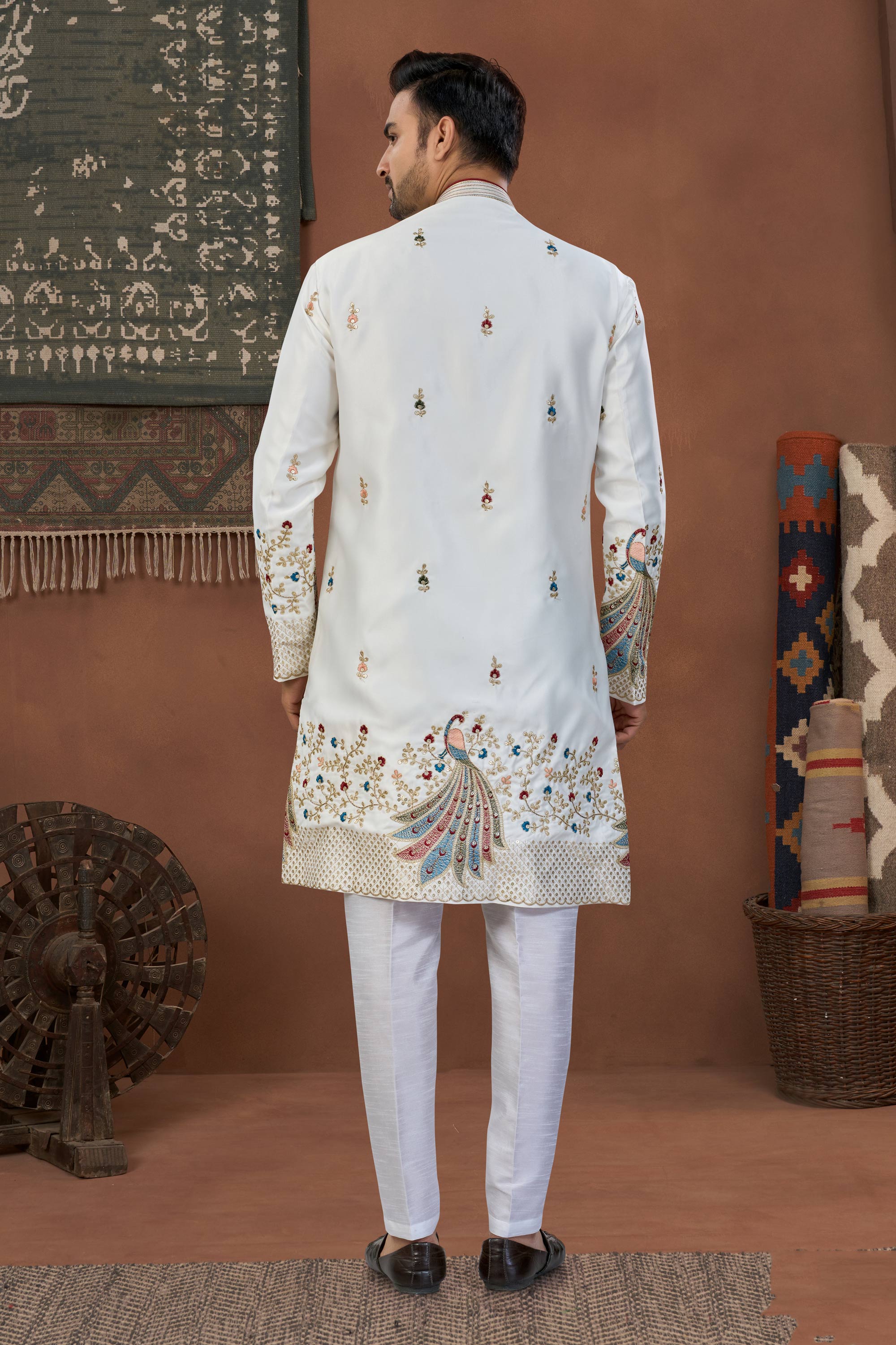 Cream Wedding Wear Art Silk Fabric Readymade Indo Western For Men