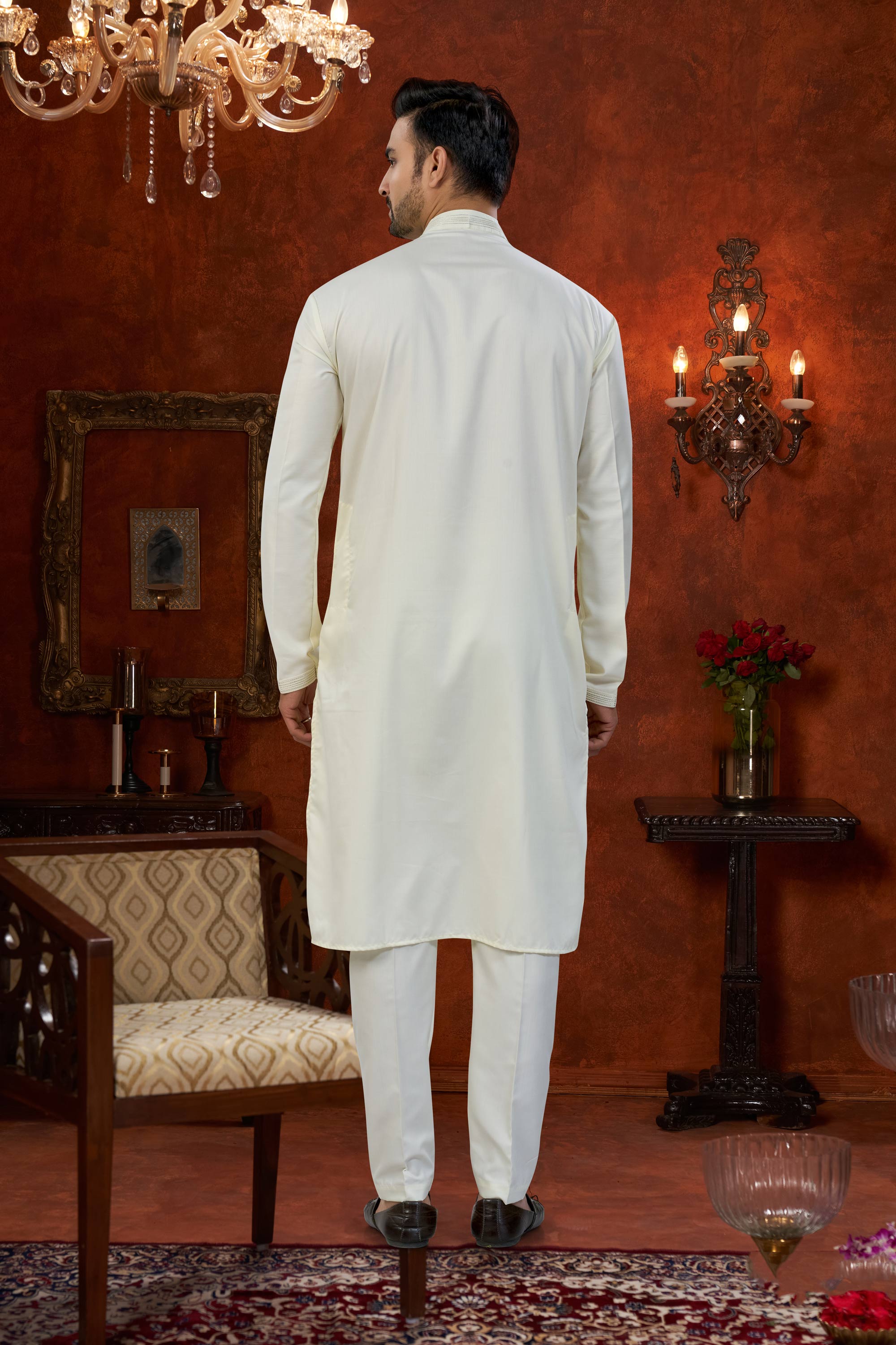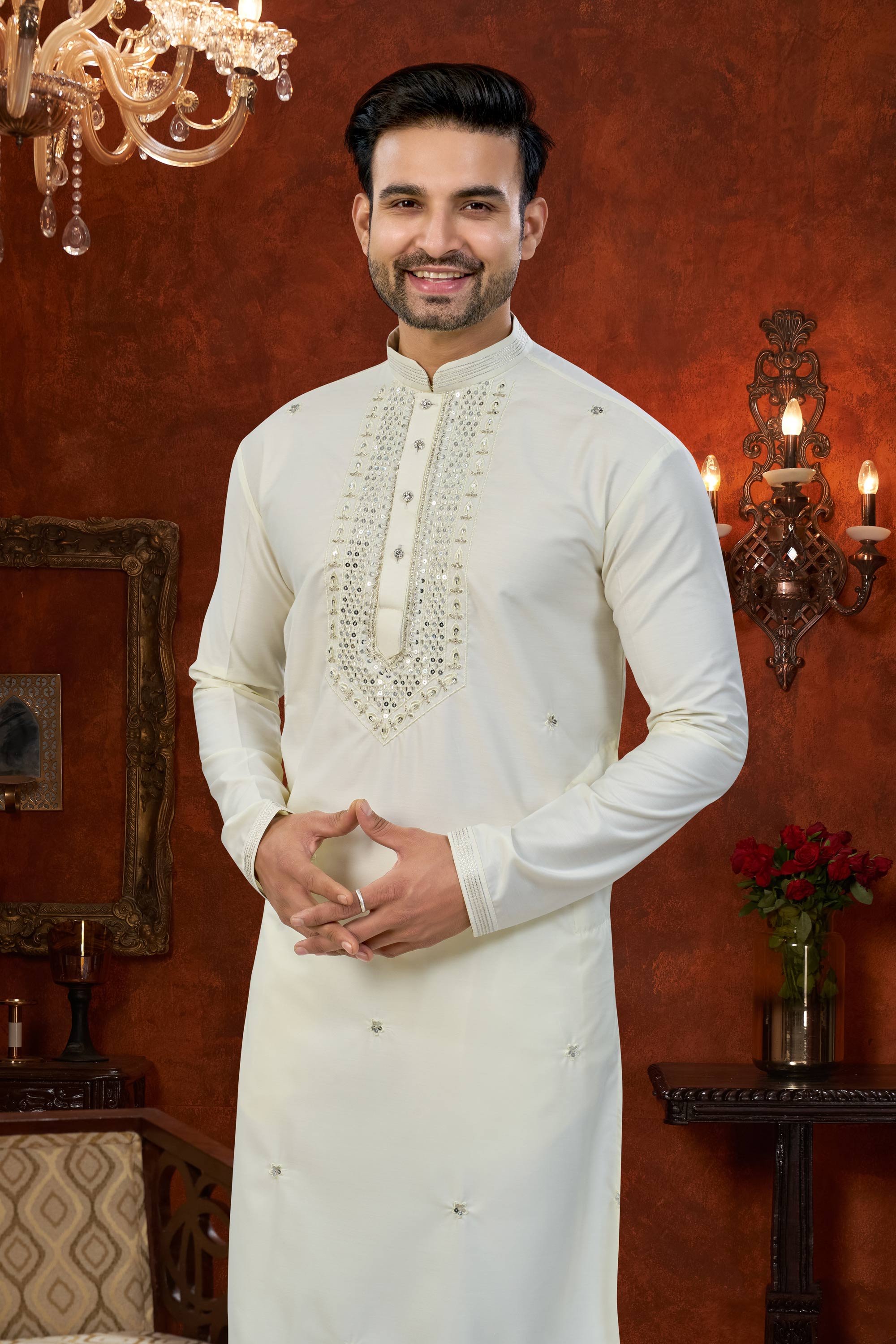 Cream Wedding Wear Art Silk Readymade Kurta Pyjama For Men