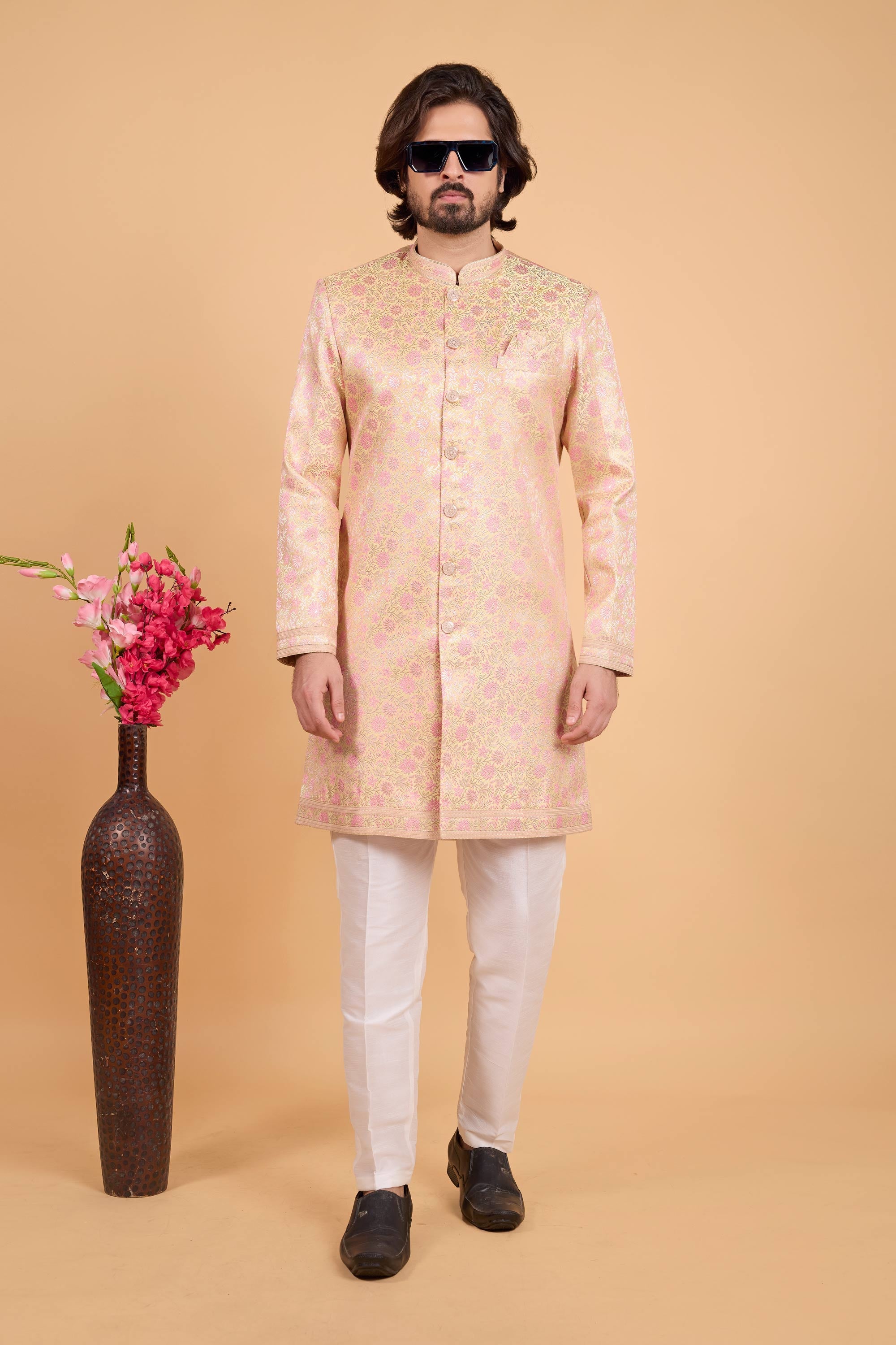 Cream Wedding Wear Zari Weaving Work Design Readymade Indowestern And Aligadhi Pant For Men