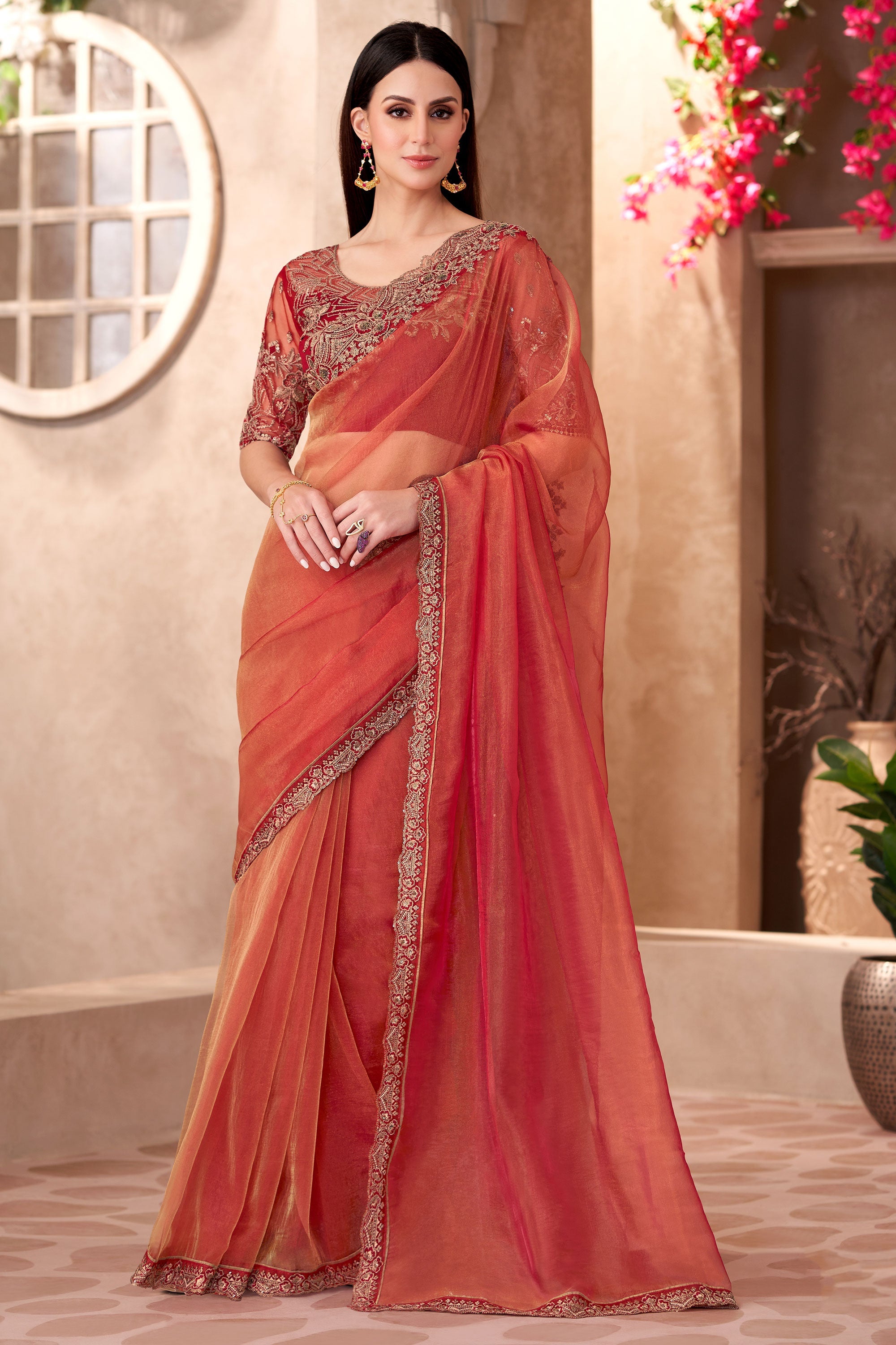 Creative Border Work On Saree In Rust Color Tissue Fabric