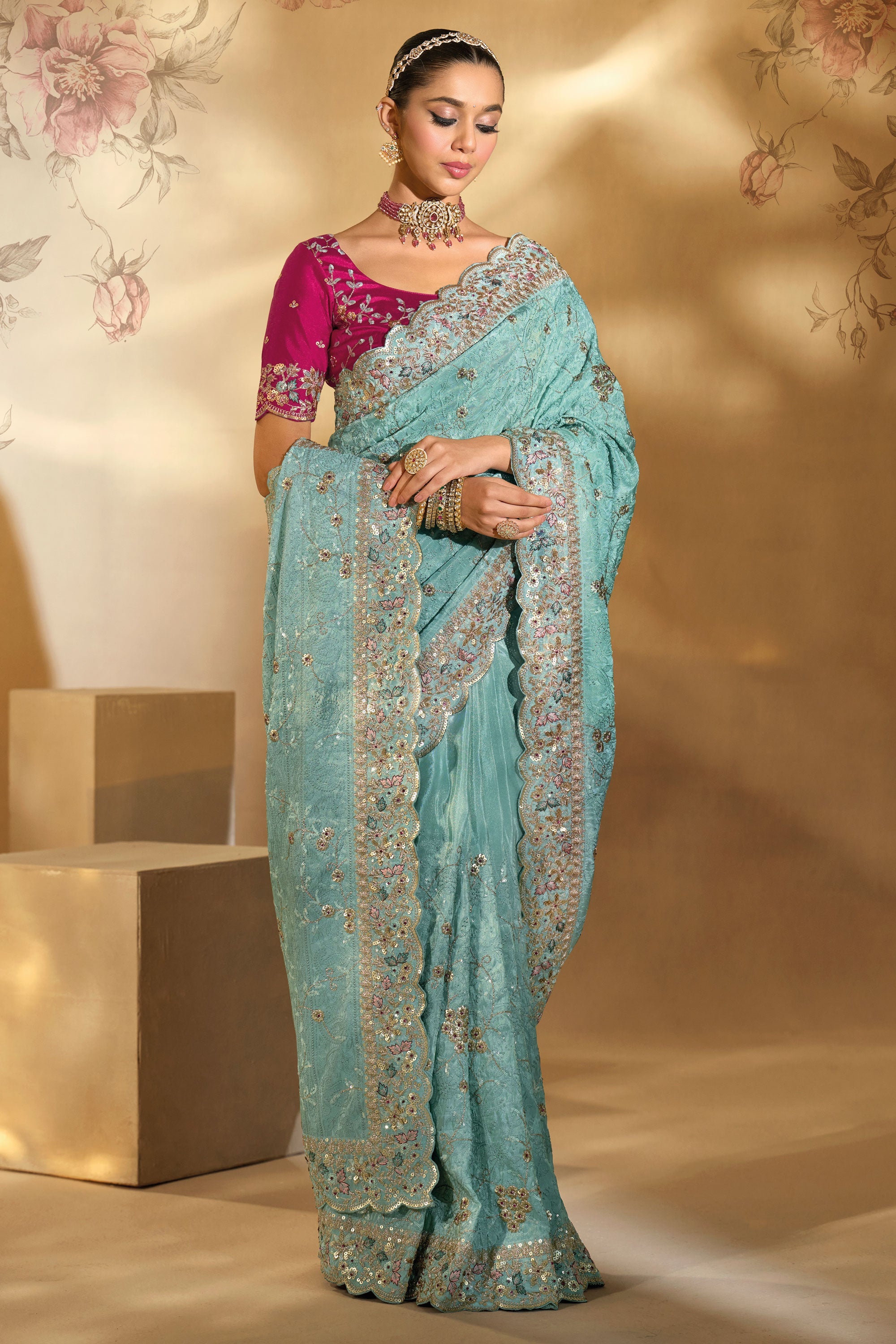 Creative Light Cyan Color Banarasi Silk Fabric Heavy Embroidered Saree
