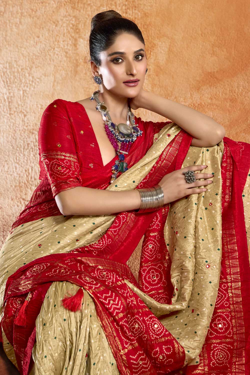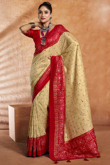 Creative Single Dot Bandhani Printed Saree In Beige Color Satin Fabric