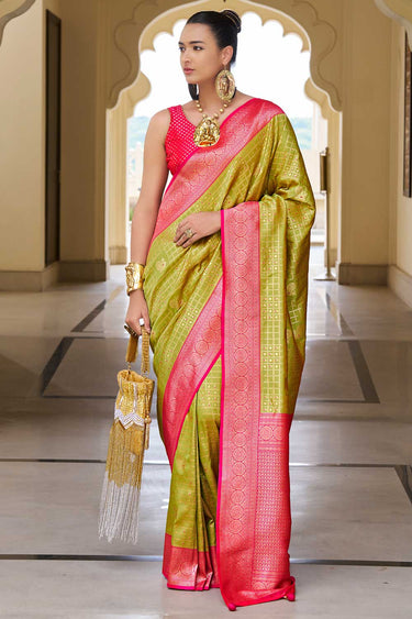 Creative Weaving Work On Banarasi Silk Saree In Olive Color