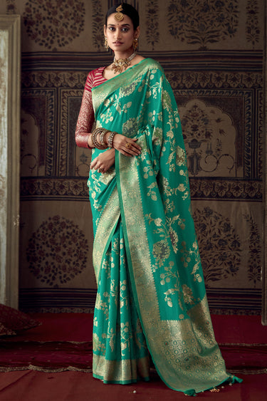 Cyan Color Designer Weaving Work Fancy Fabric Saree