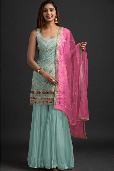 Cyan Color Function Wear Stylish Sharara Suit In Georgette Fabric
