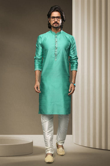 Cyan Color Jacquard Silk Fabric Sangeet Wear Readymade Kurta Pyjama For Men