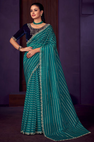 Cyan Color Stone Work Festive Wear Organza Fabric Saree