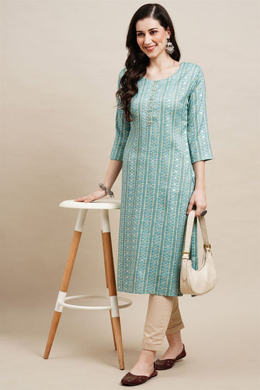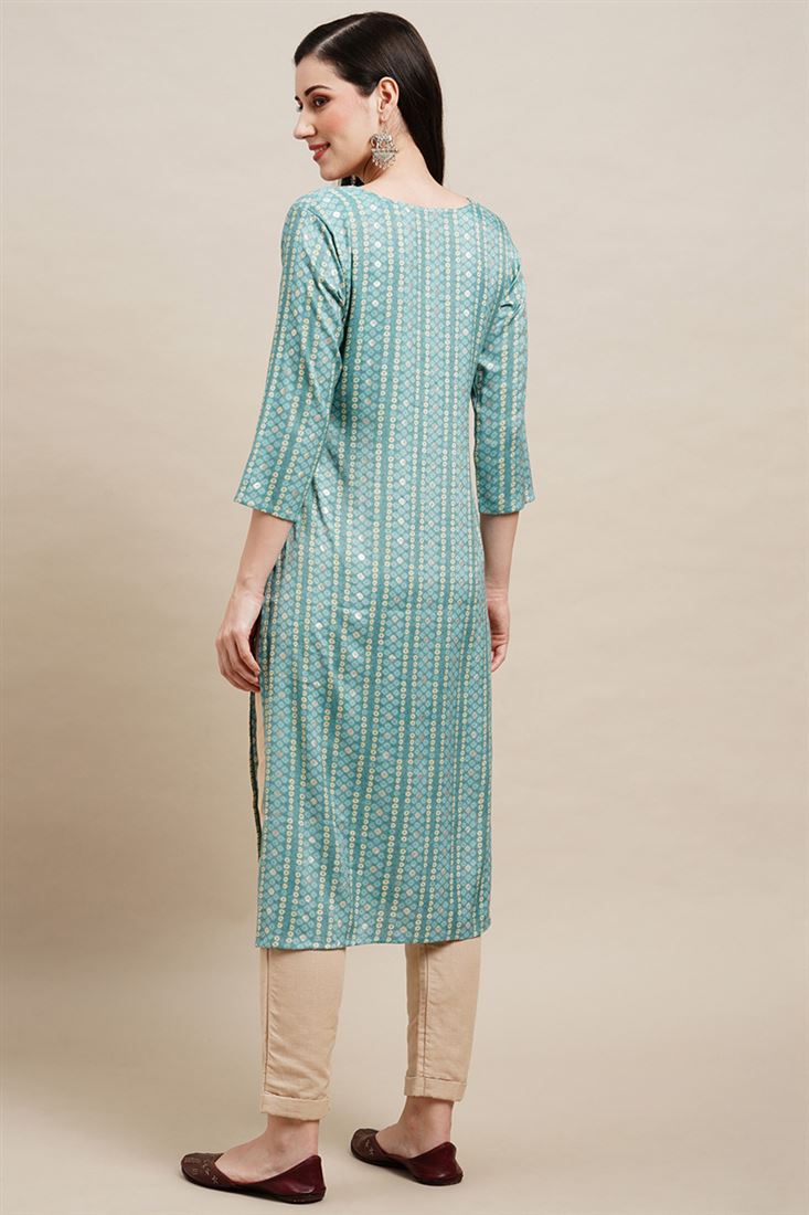 Cyan Color Straight Readymade Kurti With Printed Designs