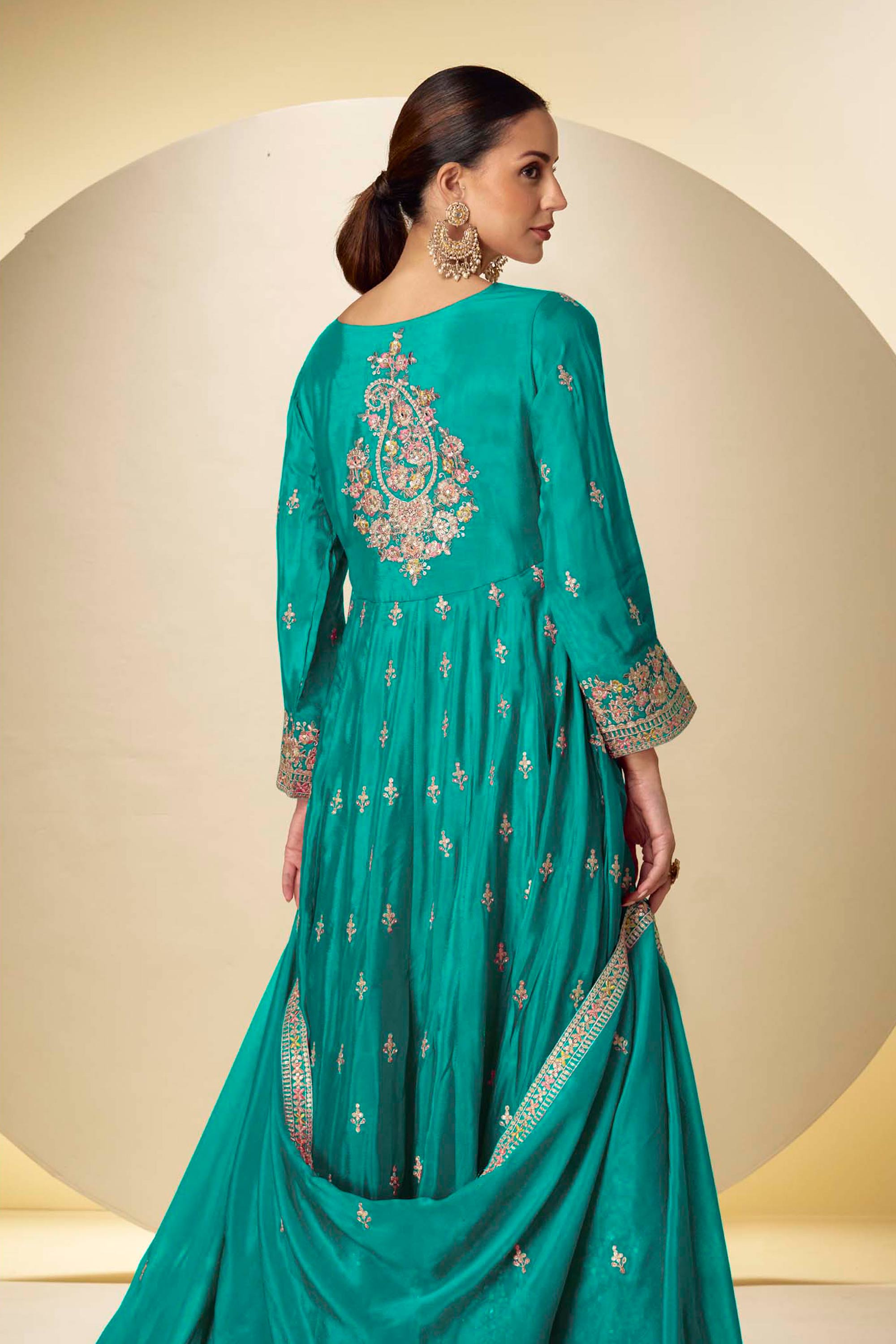 Cyan Embroidered Chinon Readymade Anarkali Style Suit