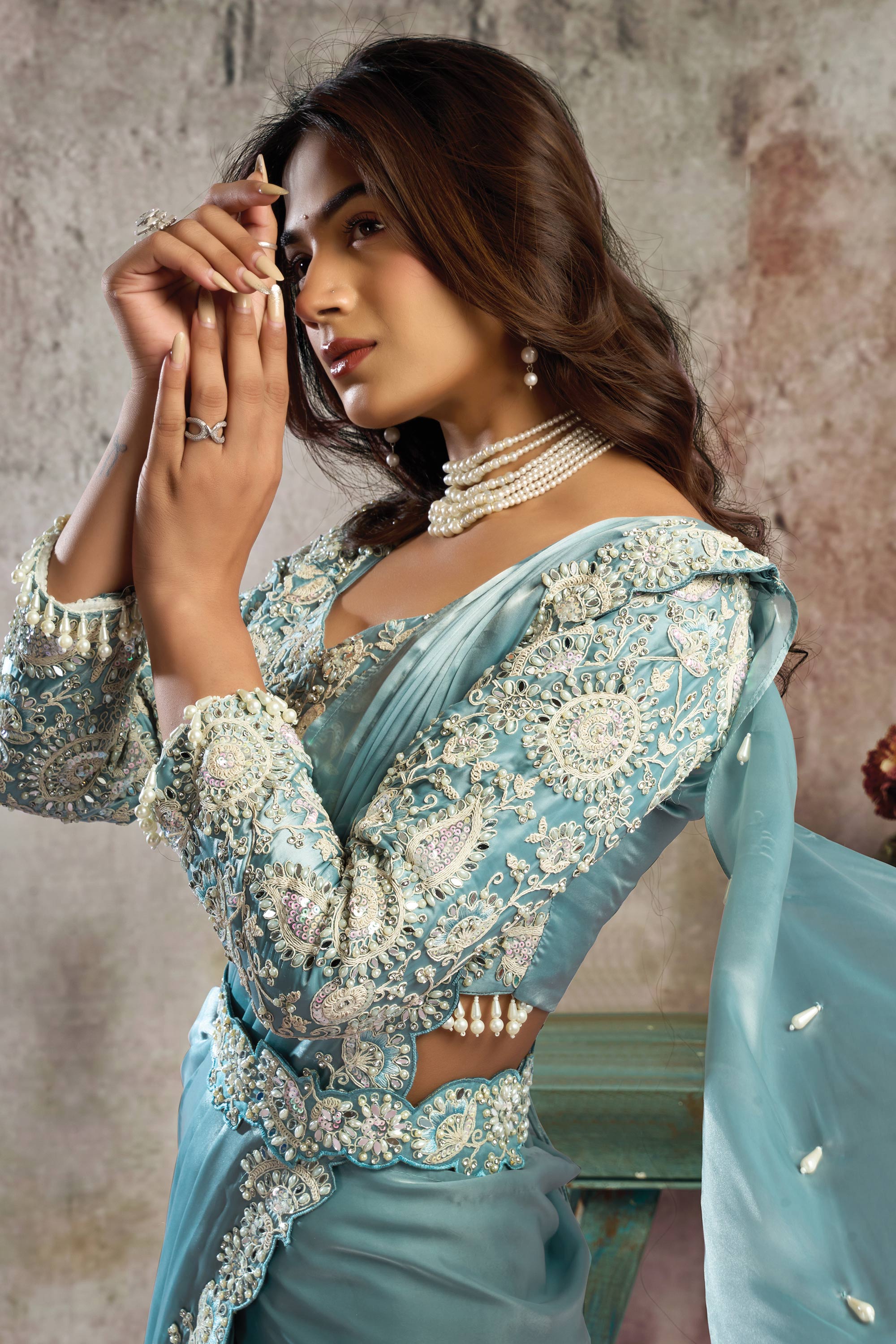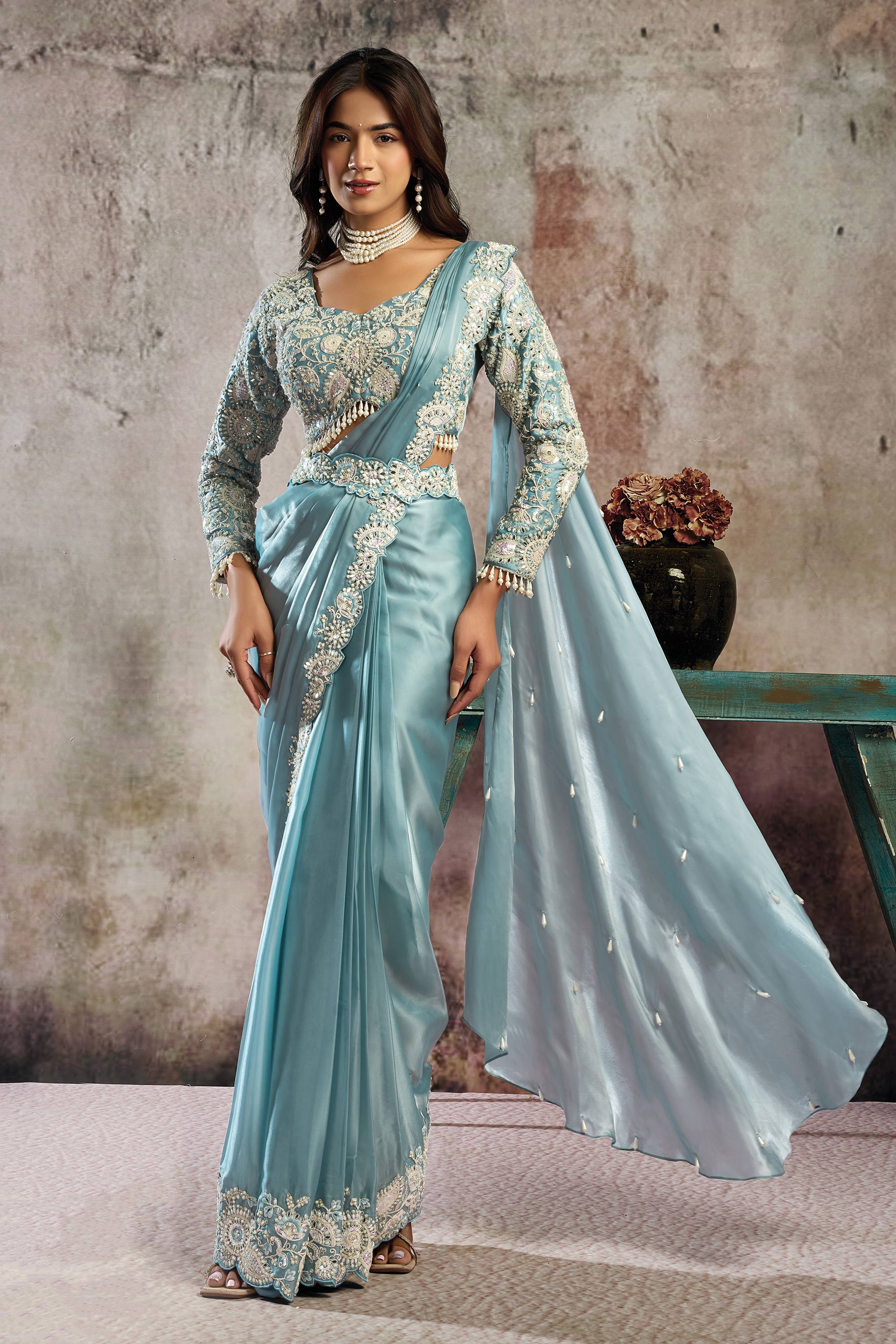Cyan Function Wear Satin Embroidered Border Work Readymade Saree