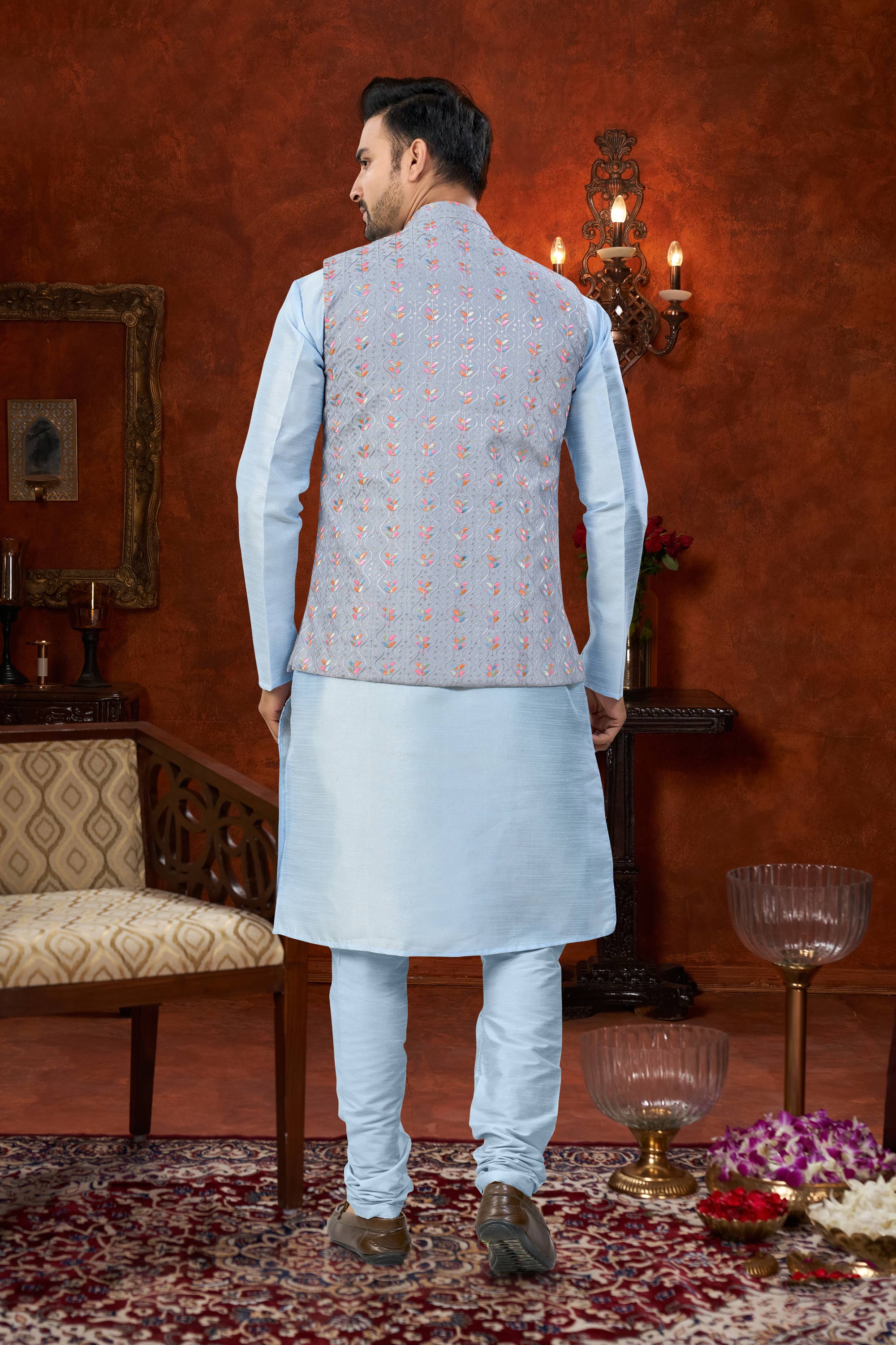 Add grace to your traditional wardrobe with this Mens Kurta Pyjama made from premium Art Silk. The Dhupion Silk pyjama bottom ensures comfort and a polished appearance. Its rich color makes it perfect for weddings and festive events. Slight color variation may occur due to digital photography.