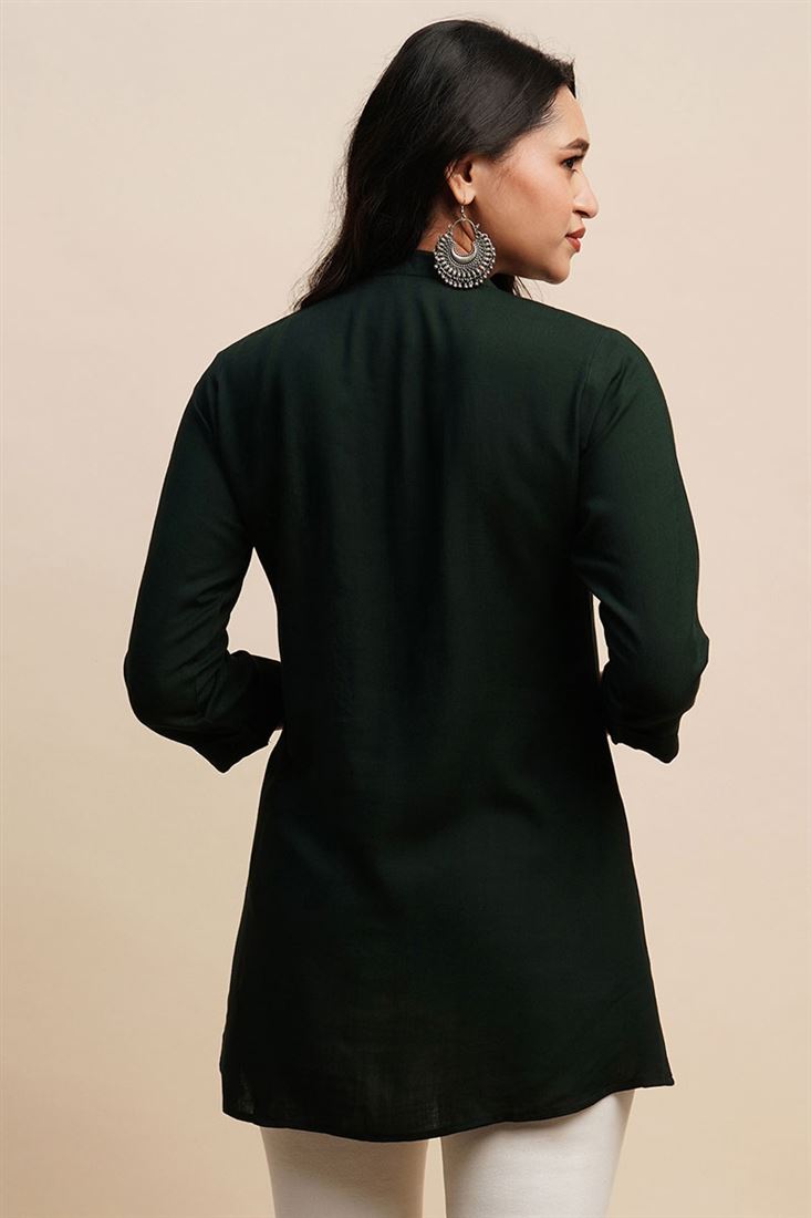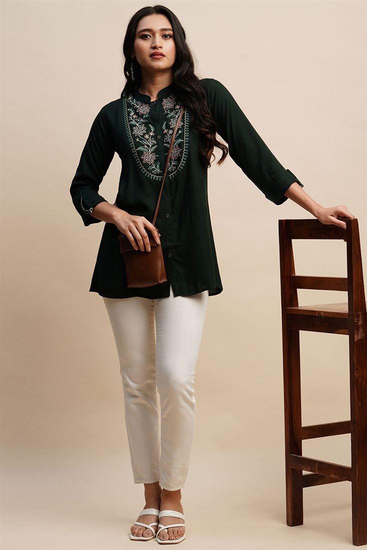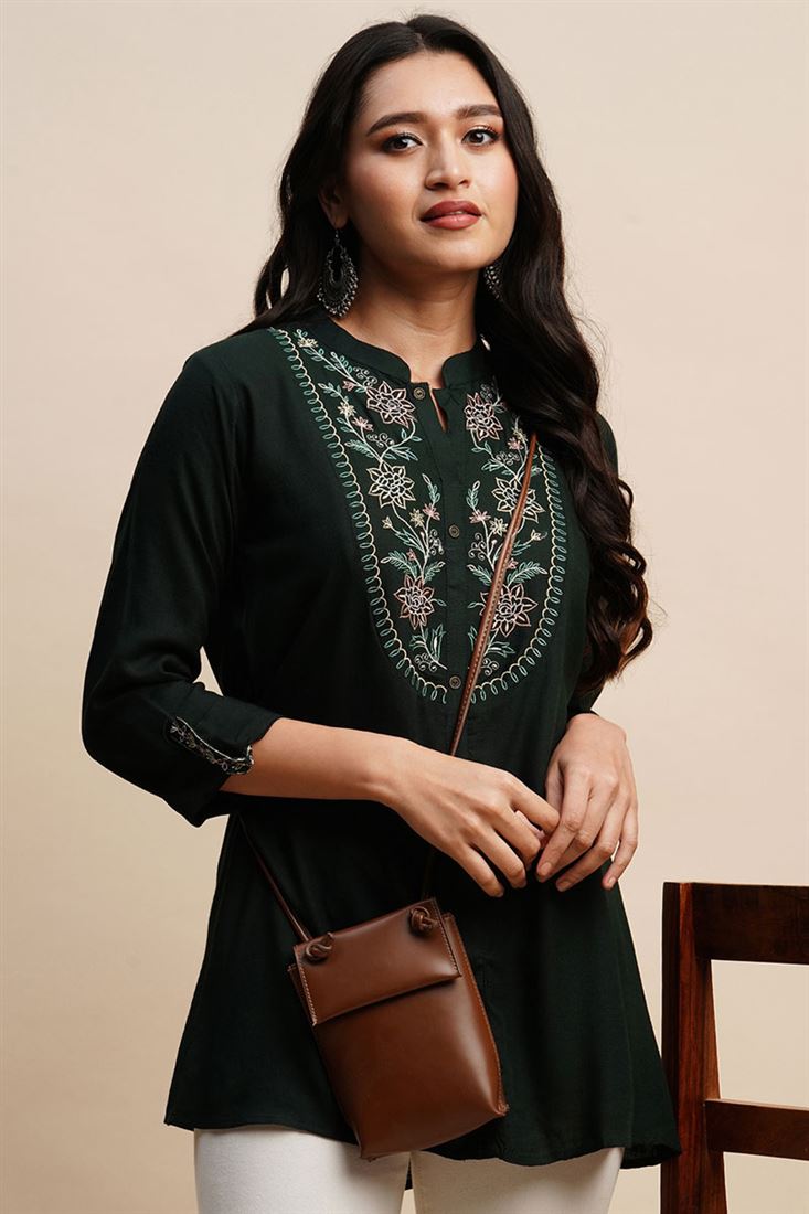 Dark Green Color Rayon Fabric Enthralling Embroidered Readymade Short Kurti