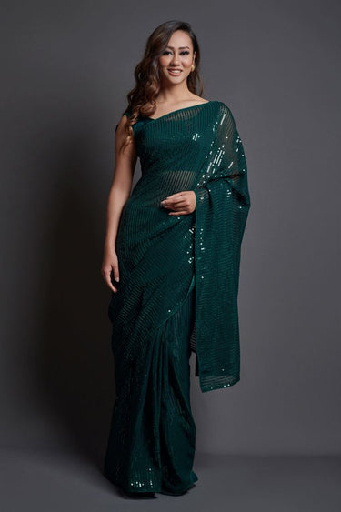 Dark Green Color Sequins Work Georgette Fabric Party Wear Stunning Saree