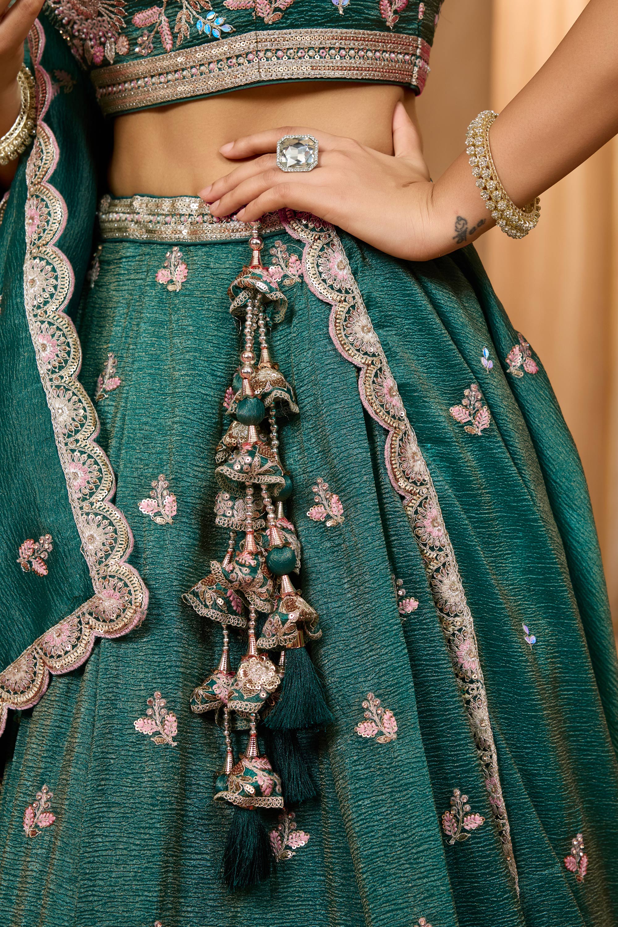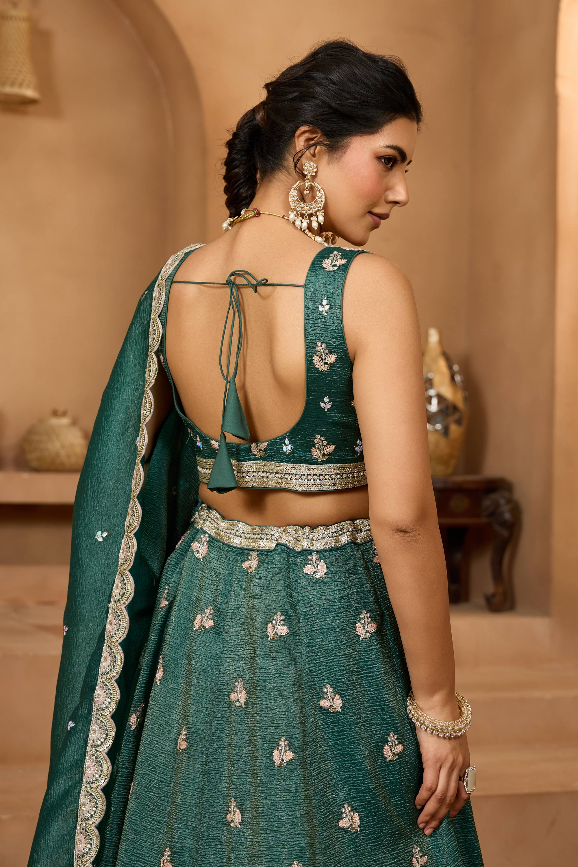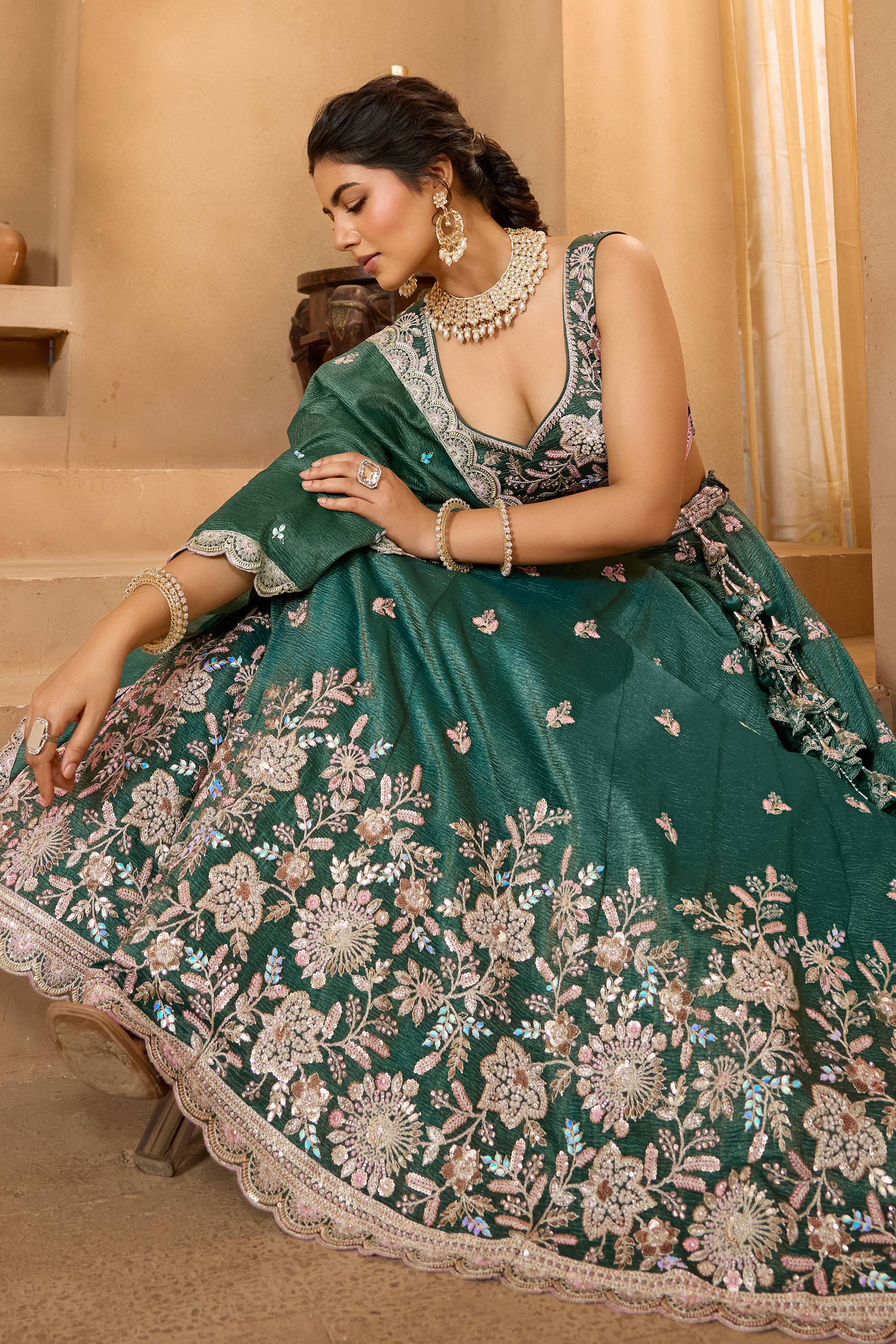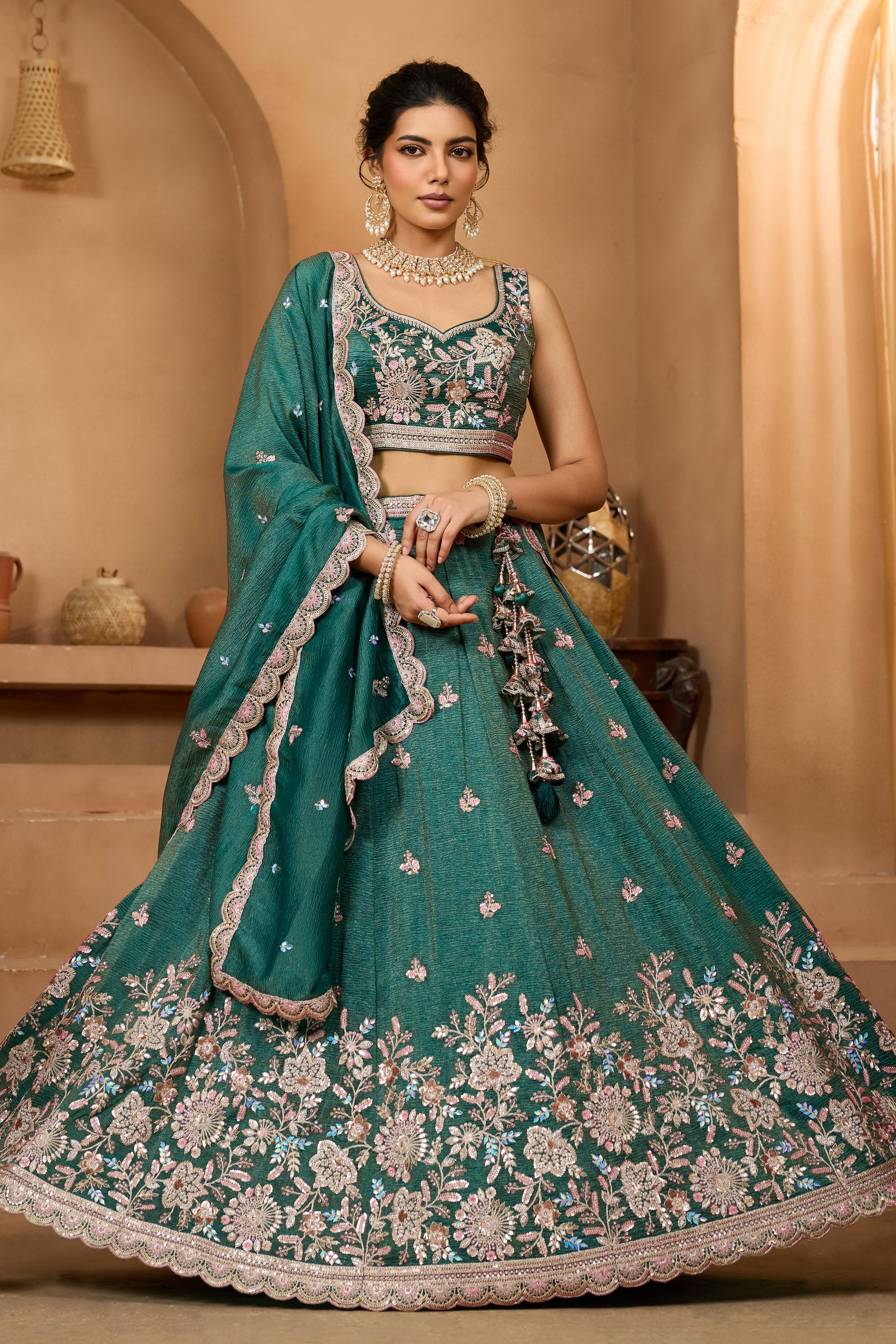 Dark Green Wedding Wear Embroidered Tissue Lehenga Choli