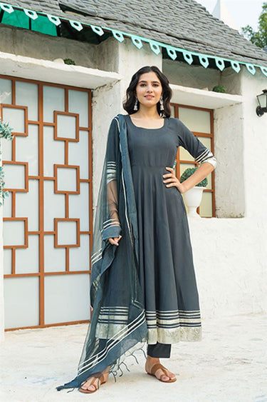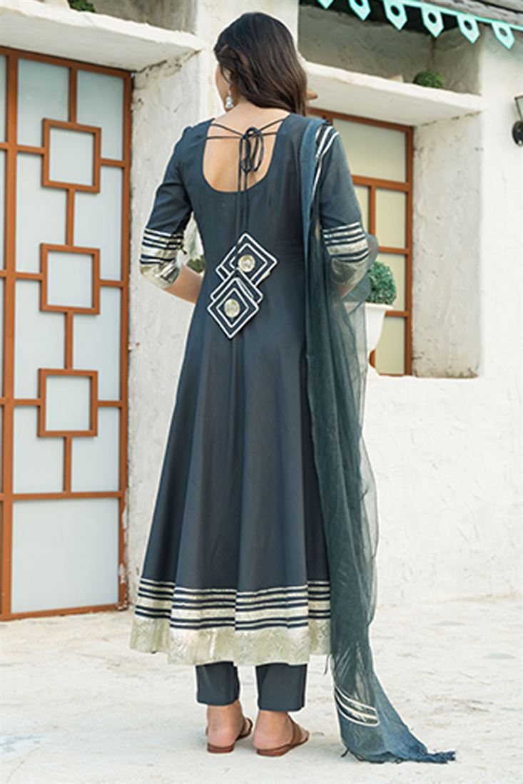 Dark Grey Color Rayon Bewitching Top Bottom Dupatta Set