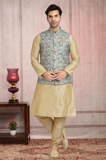 Dazzling Cream Color Kurta Pyjama With Sea Green Jacket In Banarasi Silk Fabric