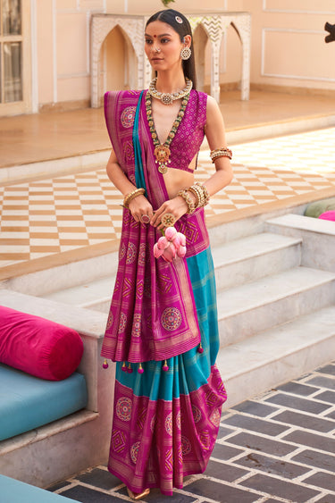 Dazzling Cyan Color Patola Printed Saree In Art Silk Fabric